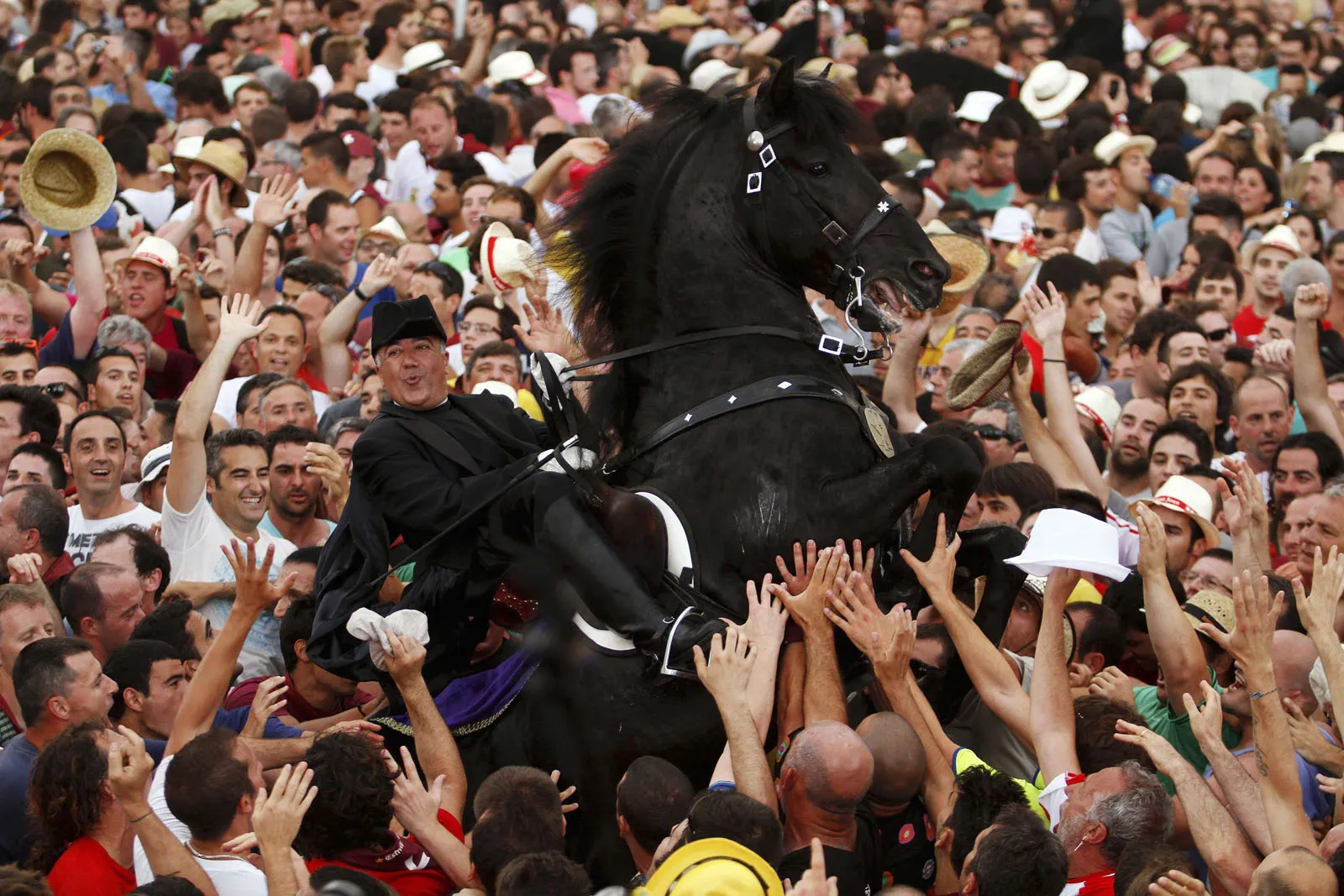 A rider rears up on his horse while surrounded by a cheering crowd during the traditional Fiesta of San Joan (Saint John) in downtown Ciutadella, on the Spanish Balearic Island of Menorca, June 23, 2013. The riders of the horses are representatives of ancient Ciutadella society – nobility, clergy, craftsmen and farmers. (Photo by Enrique Calvo/Reuters)