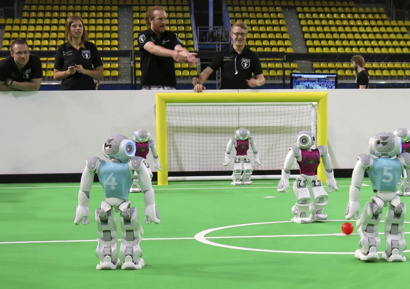 Robots in the "standard platform" division prepare for kickoff at a match held during the RoboCup championships in Eindhoven, Netherlands on Thursday, June 27, 2013. Around 300 teams from 40 countries are competing this week in the RoboCup championships. The competition has the long-term goal of building a team of androids good enough to beat the human world cup team by 2050. (Photo by Toby Sterling/AP Photo)