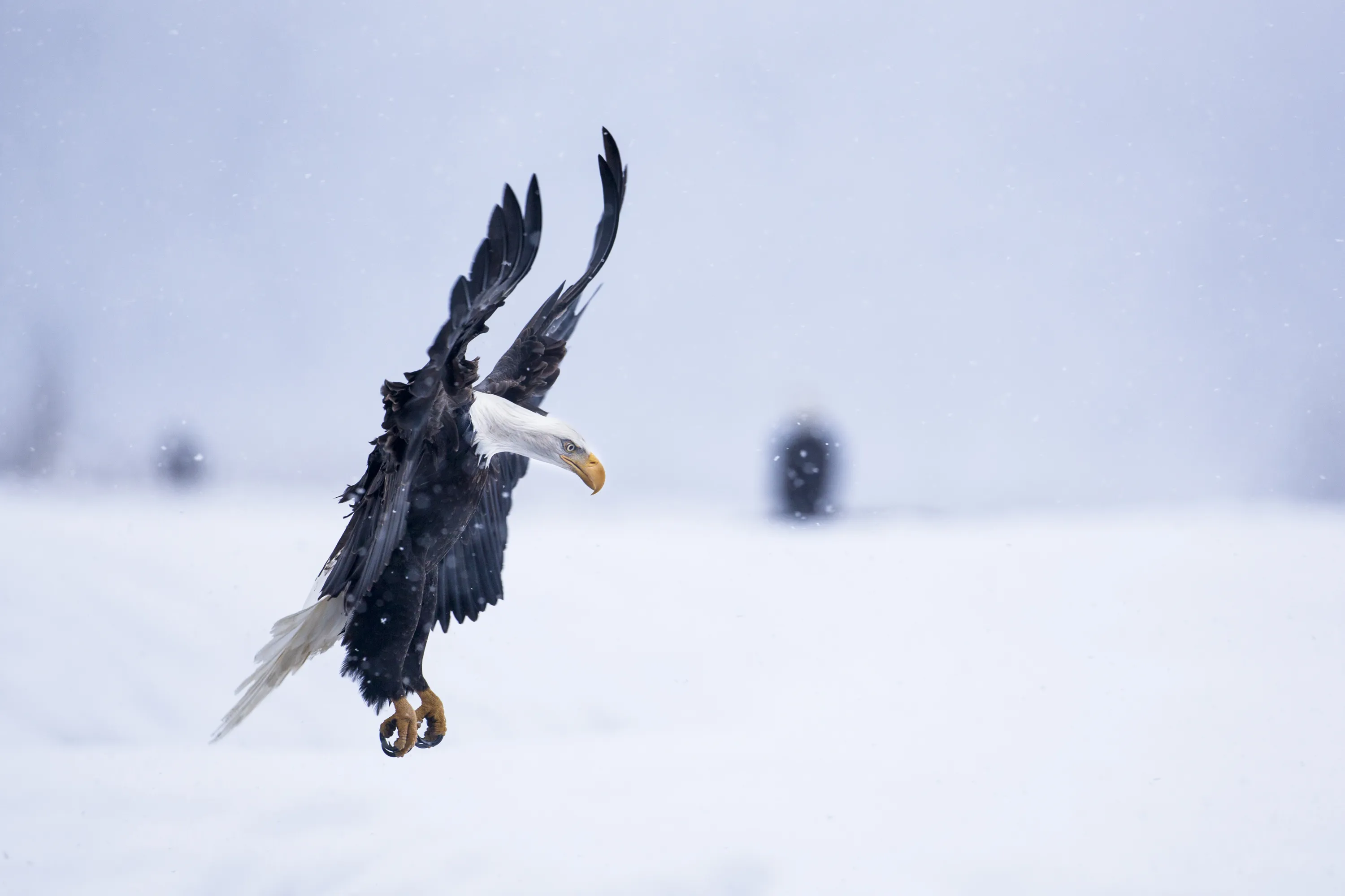 “Bald Eagle landing in snowstorm”. In late fall every years thousands of bald eagles gather along the Chilkat River in Southeast Alaska for their last feast of the season. A late fall spawning run of 10-pound chum salmon attracts this largest known congregation of bald eagles. (Photo and caption by Nicolas Dory/National Geographic Traveler Photo Contest)