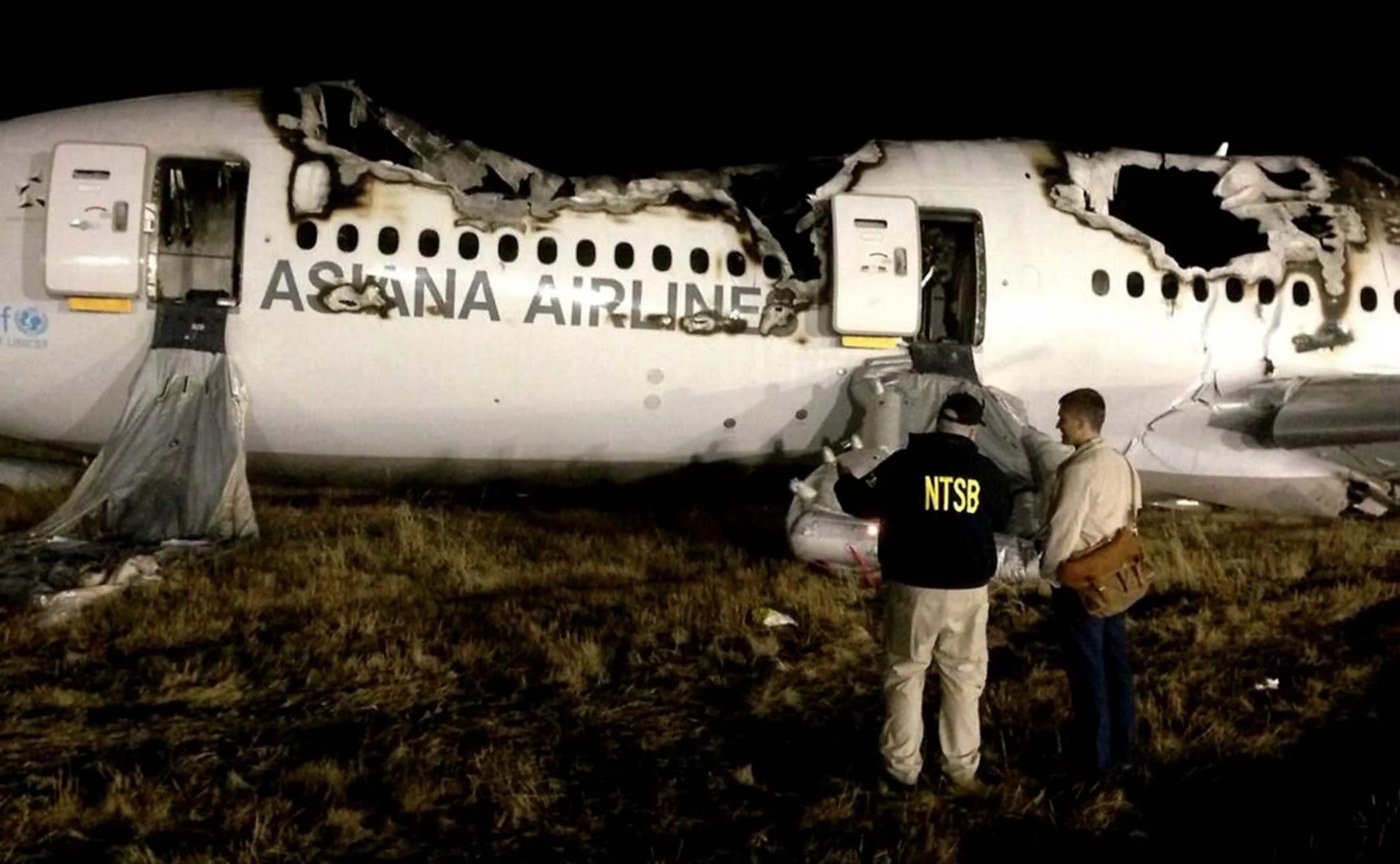NTSB investigators conduct a first site assessment overnight of Asiana Airlines flight 214 that crashed at the San Francisco International Airport. The Asiana Airlines Boeing 777 crashed while landing after a 10-hour-plus flight from Seoul, South Korea. The flight originated in Shanghai and had stopped in Seoul before the flight to San Francisco. (Photo by NTSB)