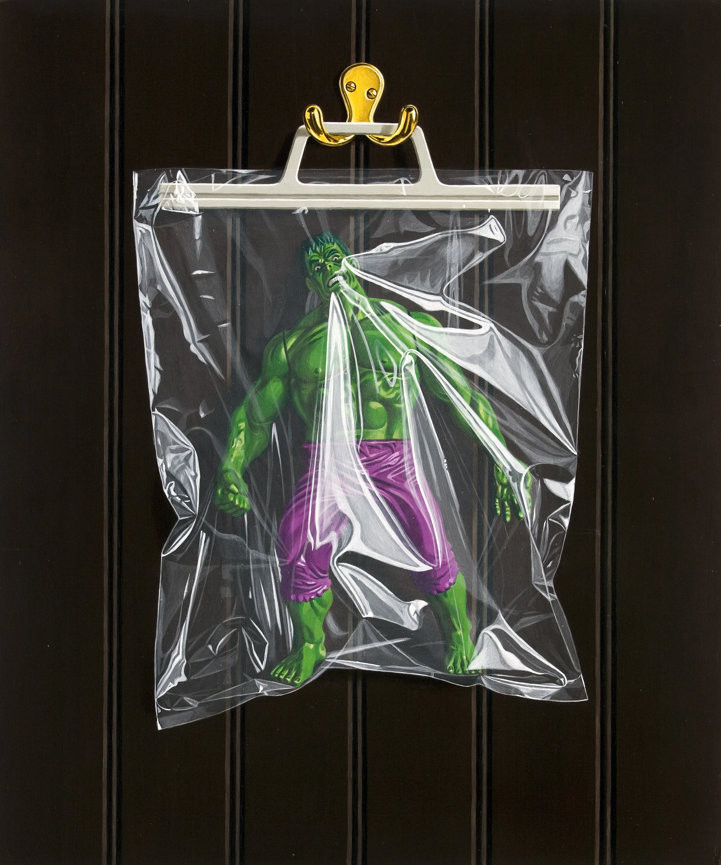 Simon Monk’s 'Secret Identity' is an ongoing series of paintings, each representing a plastic figurine of a famous superhero contained in a clear plastic bag. Bagged and hung on a hook these superheroes become recently purchased objects robbed of the enormous power they wield.