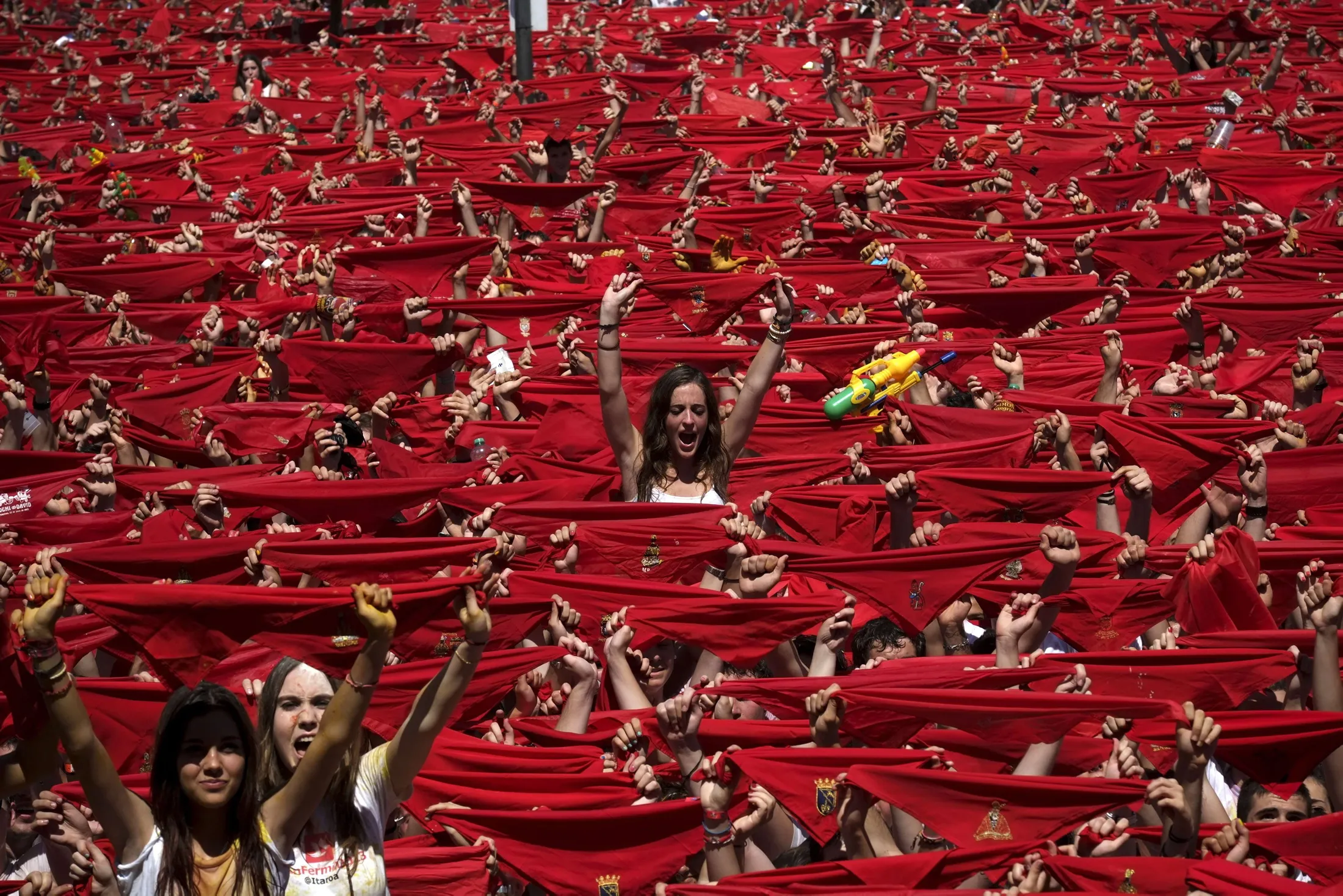 Participants hold red scarves as they celebrate the “Chupinazo” marking the start at noon sharp of the San Fermin Festival at Castle square in Pamplona, northern Spain on July 6, 2013. Ten of thousands of people packed Pamplona's streets for a drunken kick-off to Spain's best-known fiesta: the nine-day San Fermin bull-running festival. (Photo by Pedro Armestre/AFP Photo)
