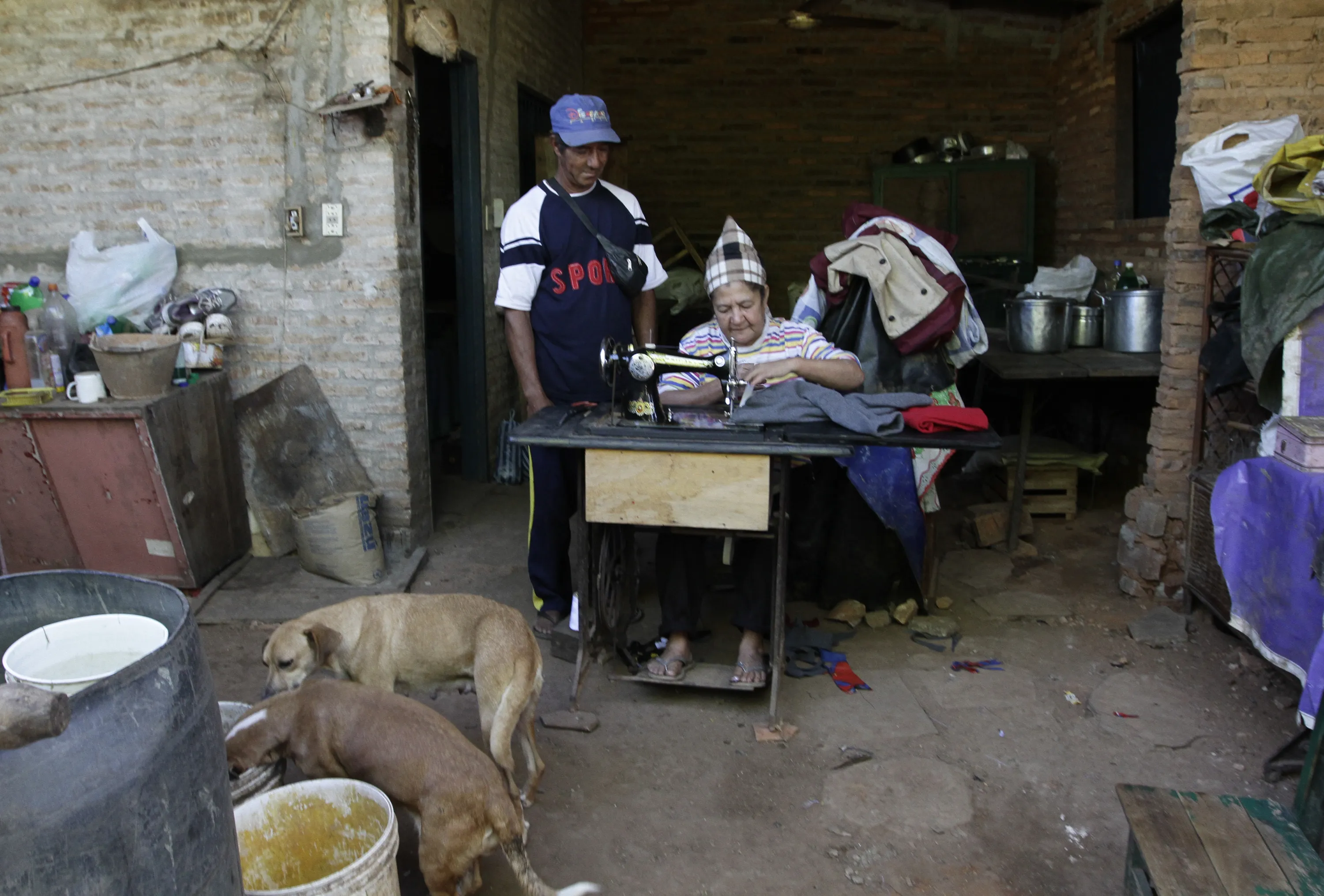 Trash recycler and craftsman Nicolas Gomez (L) watches as his wife Natividad Romero sews clothes from cloth recovered from the local landfill, at their home in Cateura, near Asuncion, May 9, 2013. The Orchestra of Recycled Instruments of Cateura is the brainchild of its conductor Favio Chavez, who wanted to help the children of garbage pickers at the local landfill, and the instruments are made from salvaged materials by craftsman Gomez. The orchestra now involves 30 schoolchildren who have toured countries in Latin America, North America and Europe to play music ranging from Beethoven and Mozart to the Beatles and Paraguayan folk songs. (Photo by Jorge Adorno/Reuters)