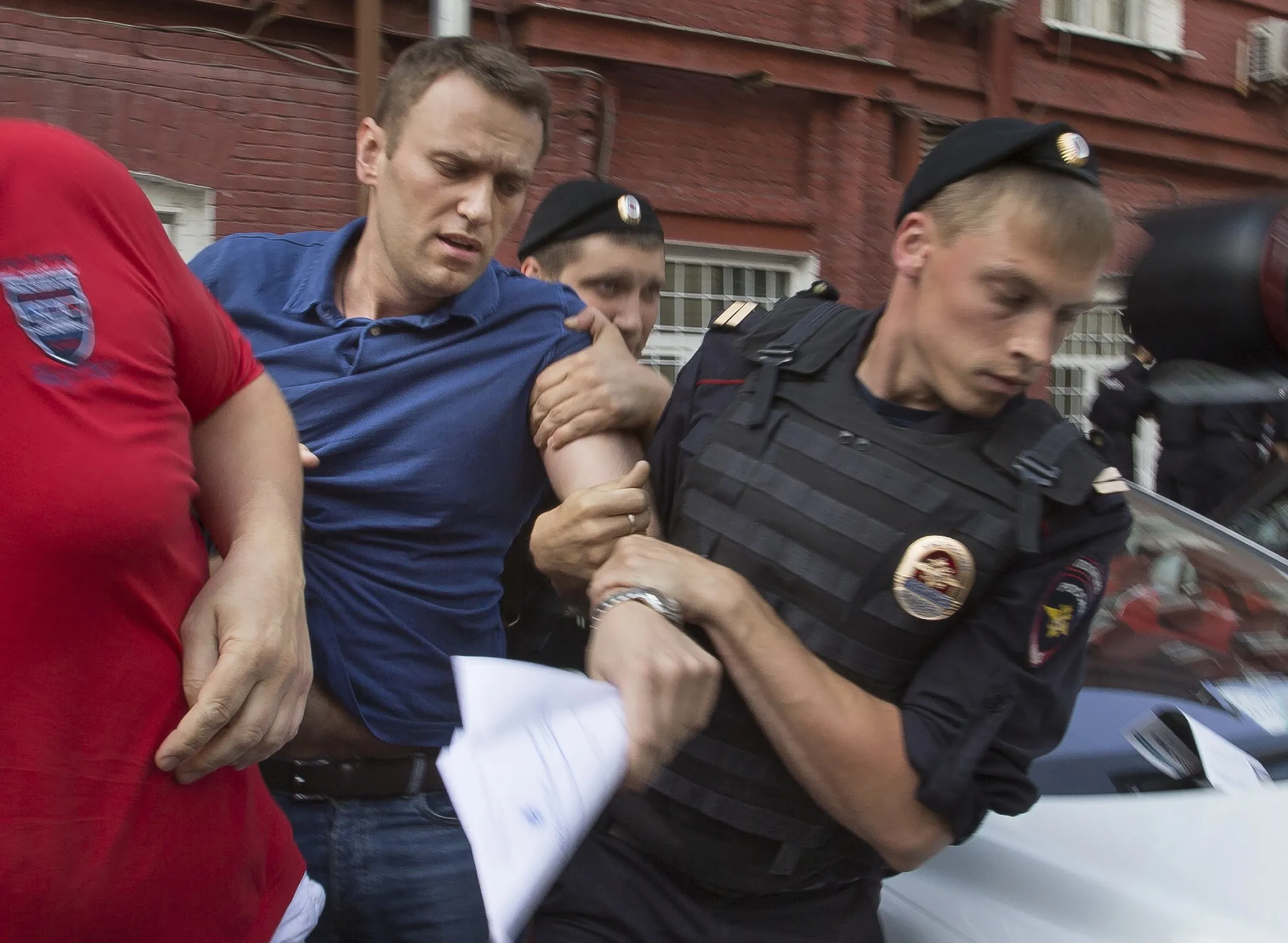 Police officers detain Russian opposition leader Alexei Navalny, left, in Moscow, Russia, Wednesday, July 10, 2013. Navalny was briefly detained by police after he spoke to a crowd of supporters outside the headquarters of Moscow's election commission. Navalny on Wednesday submitted documents to register as a candidate in the mayoral election. (Photo by Alexander Zemlianichenko/AP Photo)