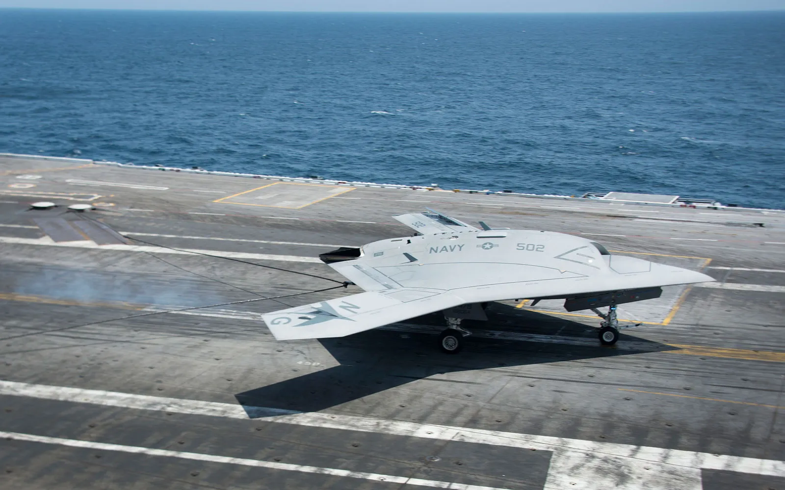An X-47B Unmanned Combat Air System (UCAS) makes the very first carrier landing aboard the USS George H.W. Bush while afloat in the Atlantic Ocean off the coast from Norfolk, Virginia, on July 11, 2013. (Photo by Jim Watson/Getty Images)