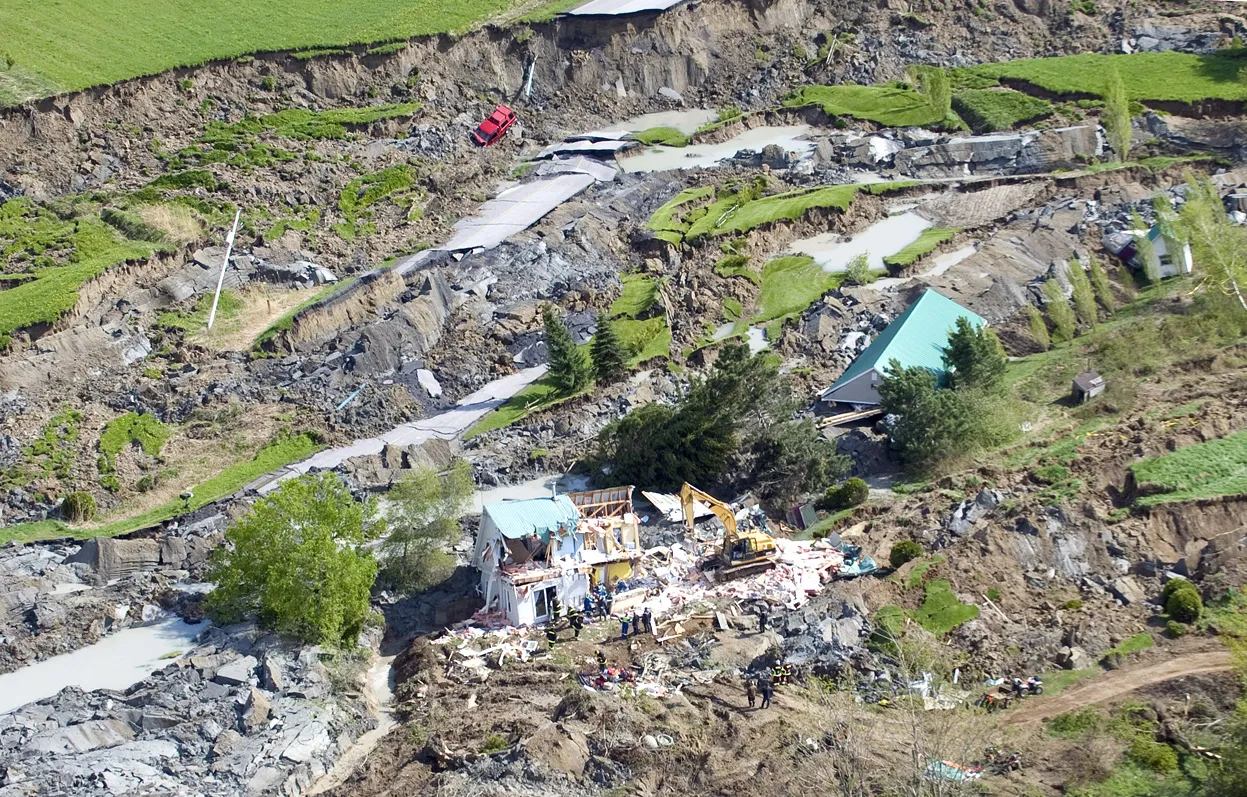 Rescuers work at the scene of a landslide in Saint-Jude, Quebec as shown from the air on Tuesday, May 11, 2010. Four people, including two children, are missing after a sinkhole triggered by a landslide swallowed their house northeast of Montreal. (Photo by Graham Hughes/AP Photo/The Canadian Press via The Atlantic)