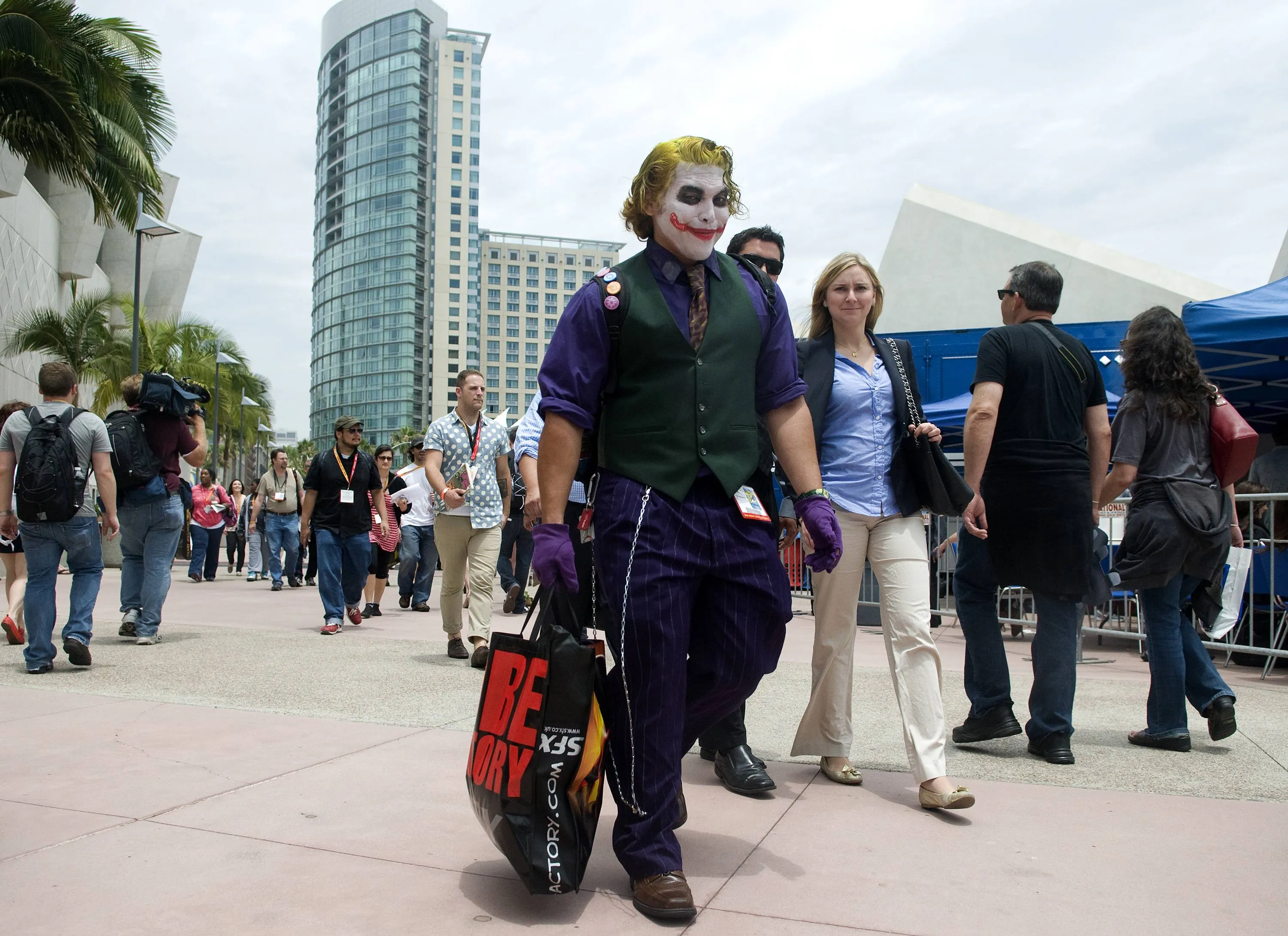 Pete Mendoza of Los Angeles, dressed as The Joker from the Batman movies, walks outside the exhibit halls at Comic-Con International in San Diego, California July 12, 2012. (Photo by Mario Anzuoni/Reuters)