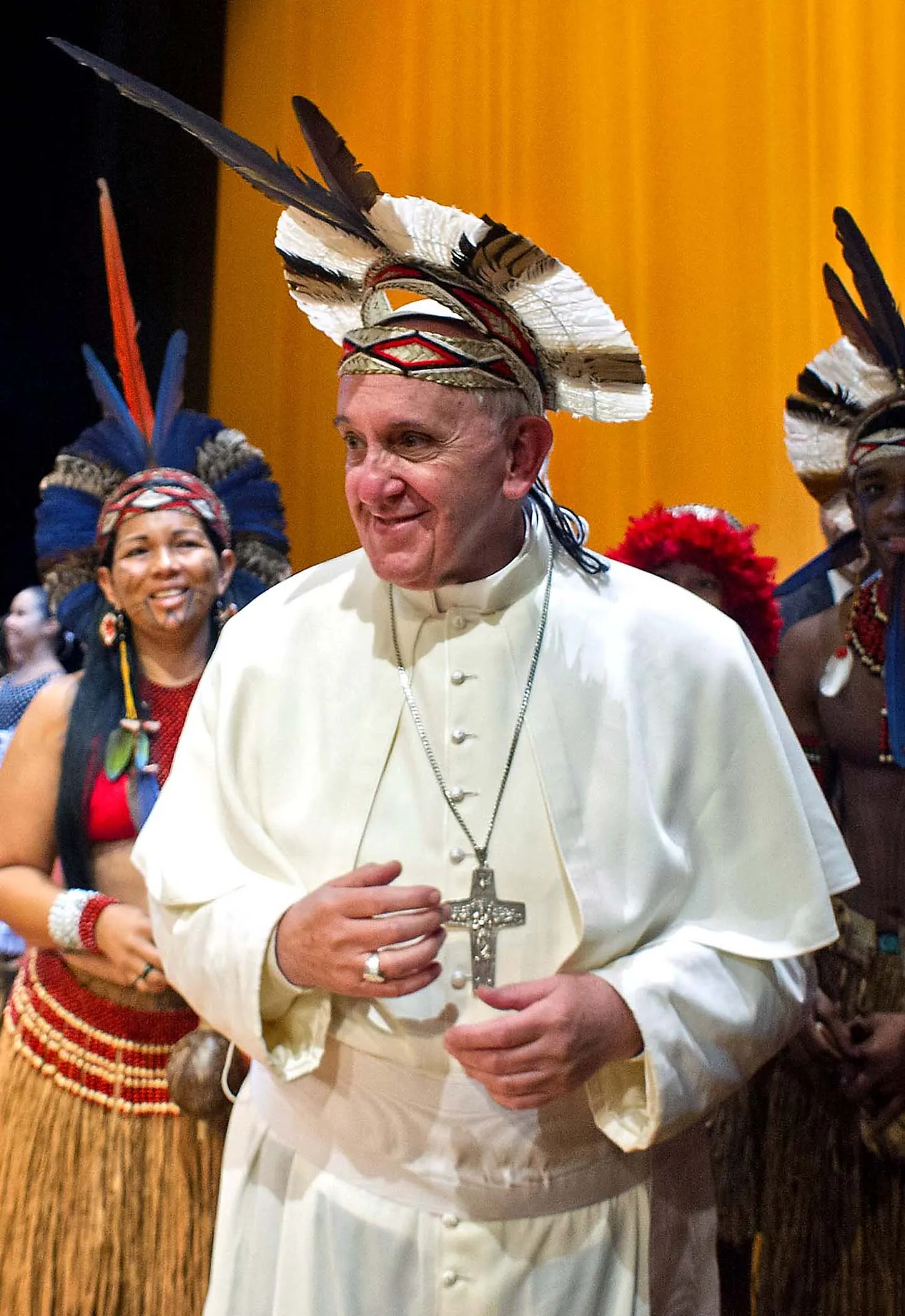 Pope Francis wears an indigenous headdress given to him by Ubirai Matos from the Pataxo tribe after the pontiff spoke at Rio's Municipal Theater. (Photo by L'Osservatore Romano)