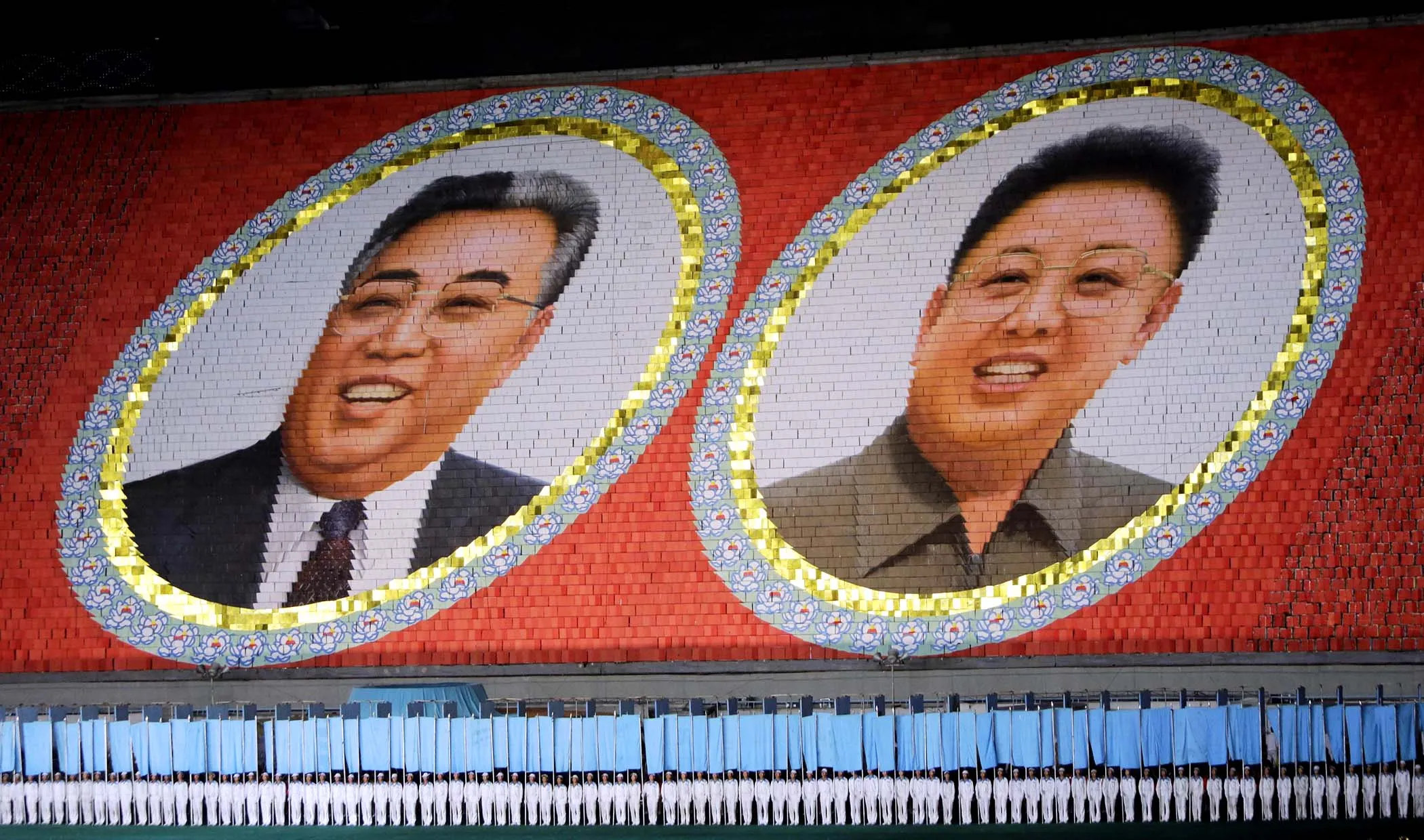 North Korean students use different colored cardboard to form portraits of late North Korean leaders Kim Jong-il and Kim Il-sung (L) as background during a mass gymnastic and artistic performance “Arirang”, in Pyongyang July 26, 2013, as part of celebrations ahead of the 60th anniversary of the signing of a truce in the 1950-1953 Korean War. (Photo by Jason Lee/Reuters)