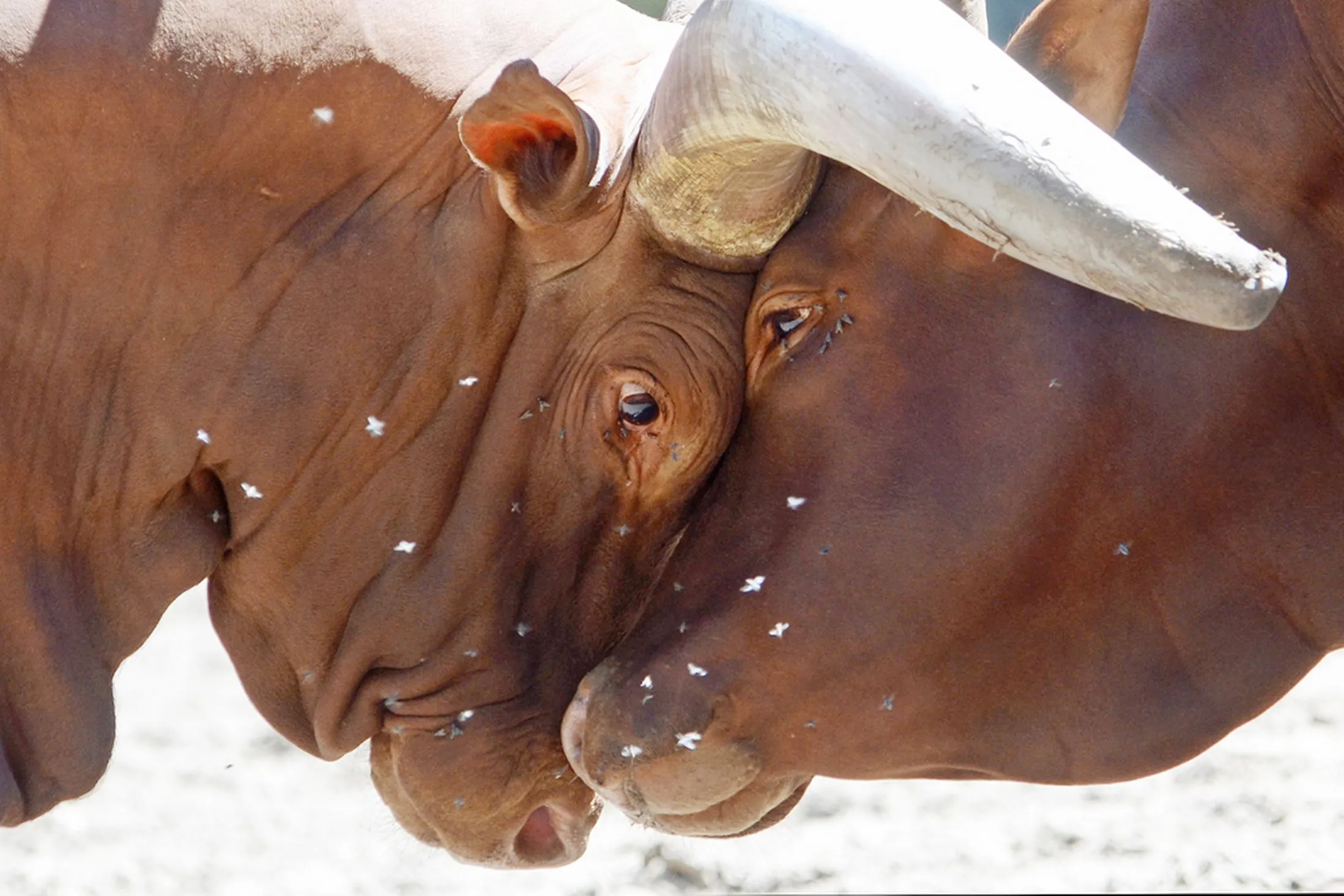 Two Ankole-Watusi bulls lock horns in their enclosure at the zoo in Duisburg, Germany, on August 2, 2013. (Photo by Horst Ossinger/AFP Photo)