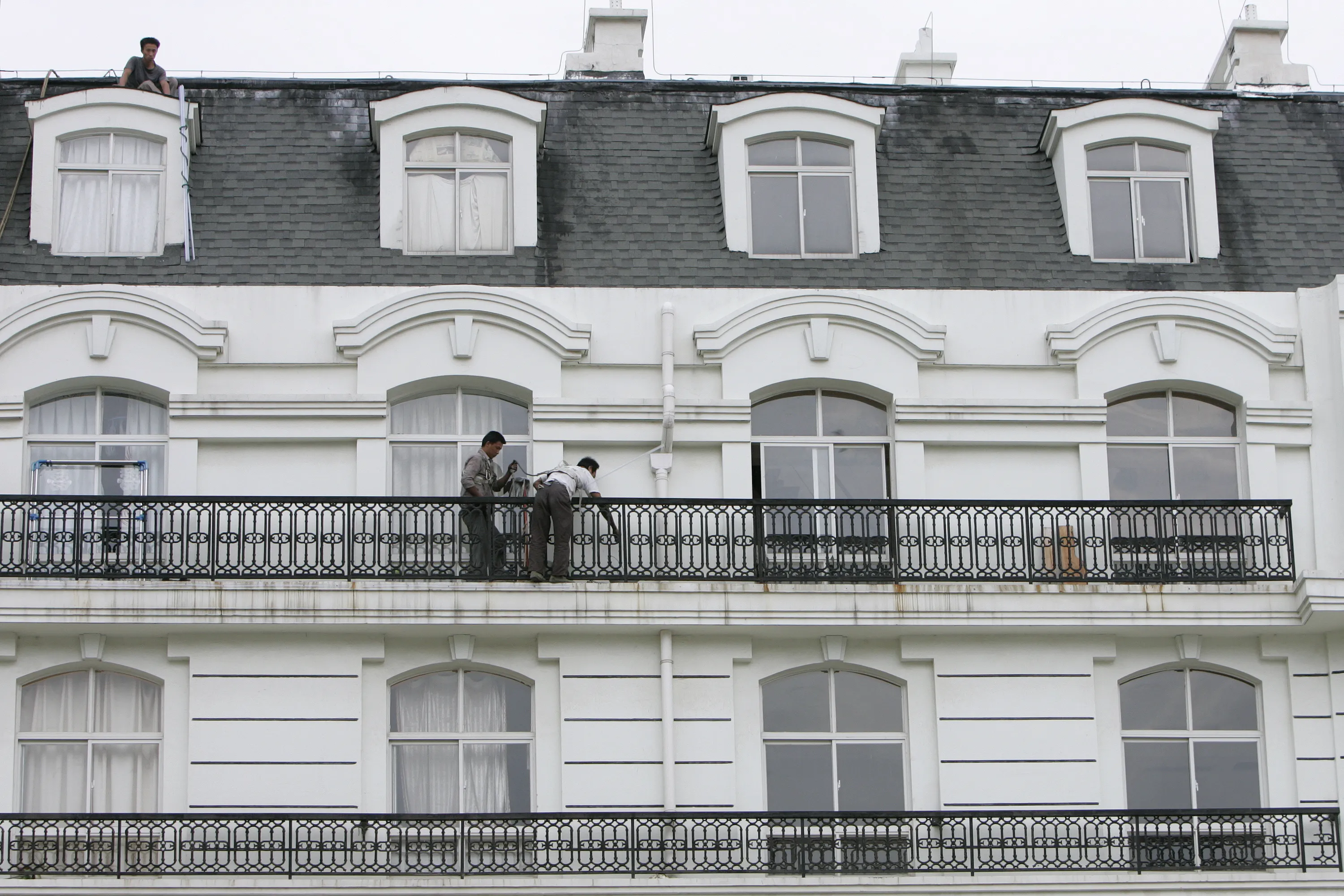 Workers stand in a balcony outside an apartment at Tianducheng, a residential area on the outskirts of Hangzhou in east China's Zhejiang province September 1, 2007. After five years of development by Zhejiang Guangsha Co. Ltd., around 2,000 residents now live in Tianducheng, local media reported. (Photo by Aly Song/Reuters)