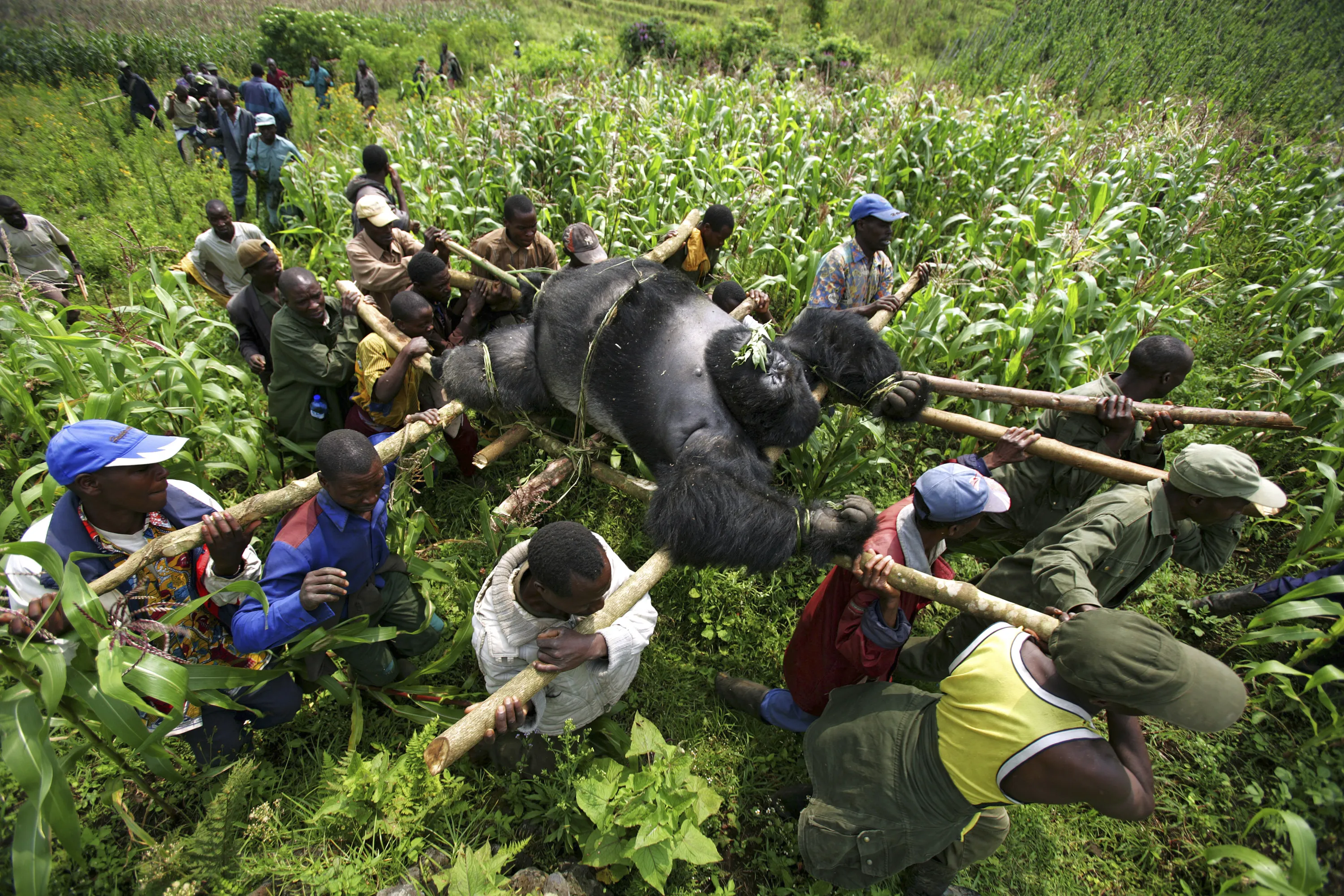 2008 Visa d'or Feature: Brent Stirton. Conservation Rangers from an Anti-Poaching unit work with locals to evacuate the bodies of four Mountain Gorrillas killed in mysterious circumstances in the park, July 24, 2007, Virunga National Park, Eastern Congo. A Silver-Back Alpha male, the leader of the group was shot, three females were also killed. Two of the females had babies and the other was pregnant. The two babies were not found and it is thought that they will have died of stress and dehydration. The motivation for the killing is not known but it is suspected that there are political motivations. The local illegal Charcoal industry clashes with conservation efforts in this very poor area and Rangers have been threatened, tortured and killed as a result of this clash of political and economic wills. Over 100 Rangers have been killed in their efforts to protect the Gorrillas of Virunga, one of the world's most endangered species. The Congolese Rangers in this particular group are working with Wildlife Direct, a Conservation organisation. The Rangers receive a salary based on donations to Wildlife Direct and perform one of the most dangerous jobs in the world of wildlife conservation. The DRC has the highest toll of human casualties of any country since the second world war, a figure in the region of 4.6 million dead as a result of war and resultant displacement, disease, starvation and ongoing militia violence. “A small miracle occurs every night in Perpignan: Jean-François seduces us back into feeling pride and common purpose through the greatest slideshow on earth. We sit there enraptured; when the work is magnificent, we are moved, uplifted and re-energized. Jean-François has found a way of holding up a mirror to the best in us and through that mirror we remember who we are and why we love this profession. Our petty jealousies, our swelling egos, our insecurities – all of these are laid low and we are elevated to an enlightened appreciation of each other. After the shows, this feeling permeates our conversations. We remember that there are extraordinary people amongst us and that we are fortunate to have such role models and to have the possibility of being necessary in the world. Jean-François and his team make that possible every year in their own imitable style; we should all be very grateful”. (Photo by Brent Stirton/Exclusive by Getty Images)