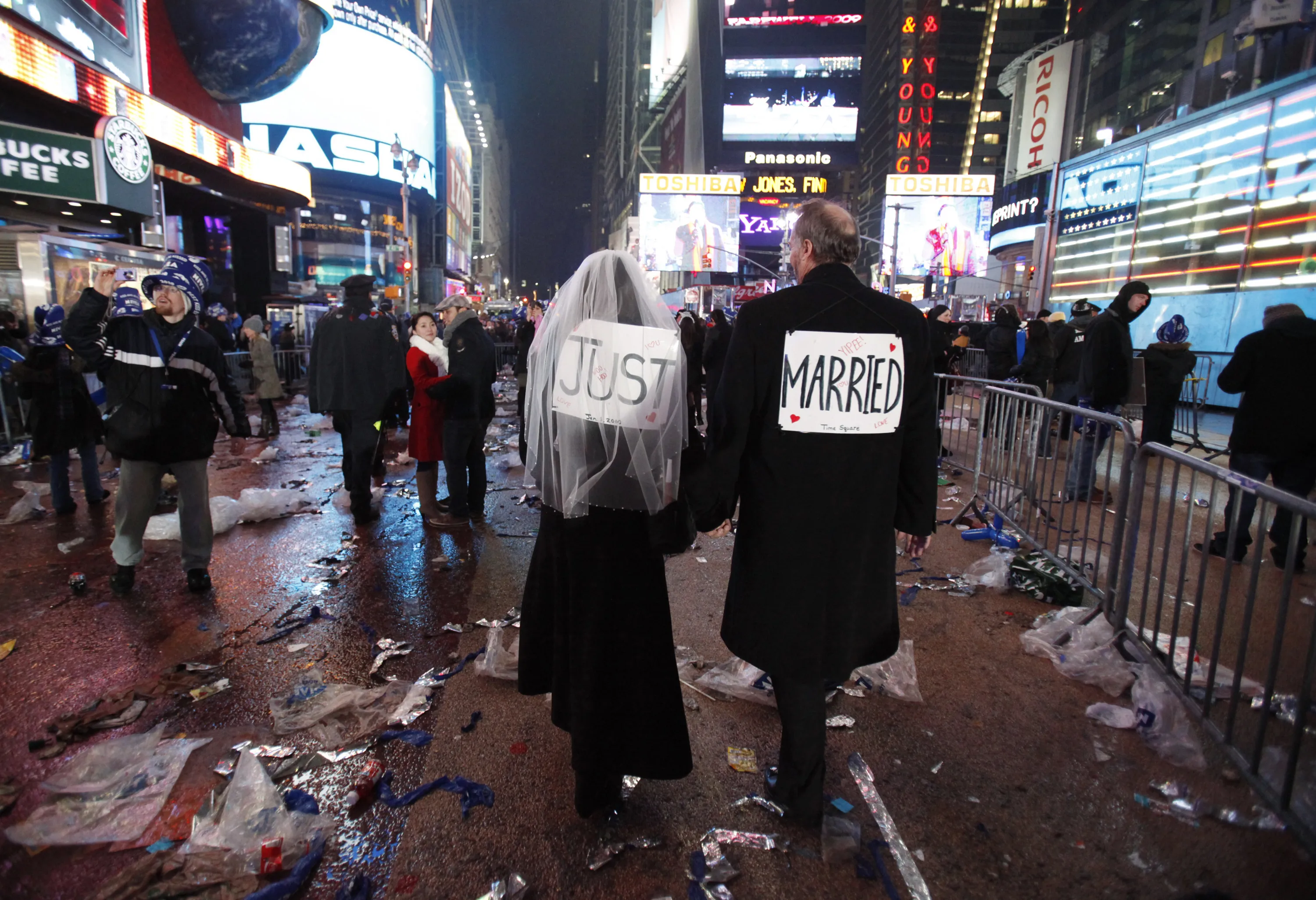 Melessa and Rick Clark leave the New Year celebration after exchanging vows in Times Square, New York January 1, 2010. (Photo by Jessica Rinaldi/Reuters)