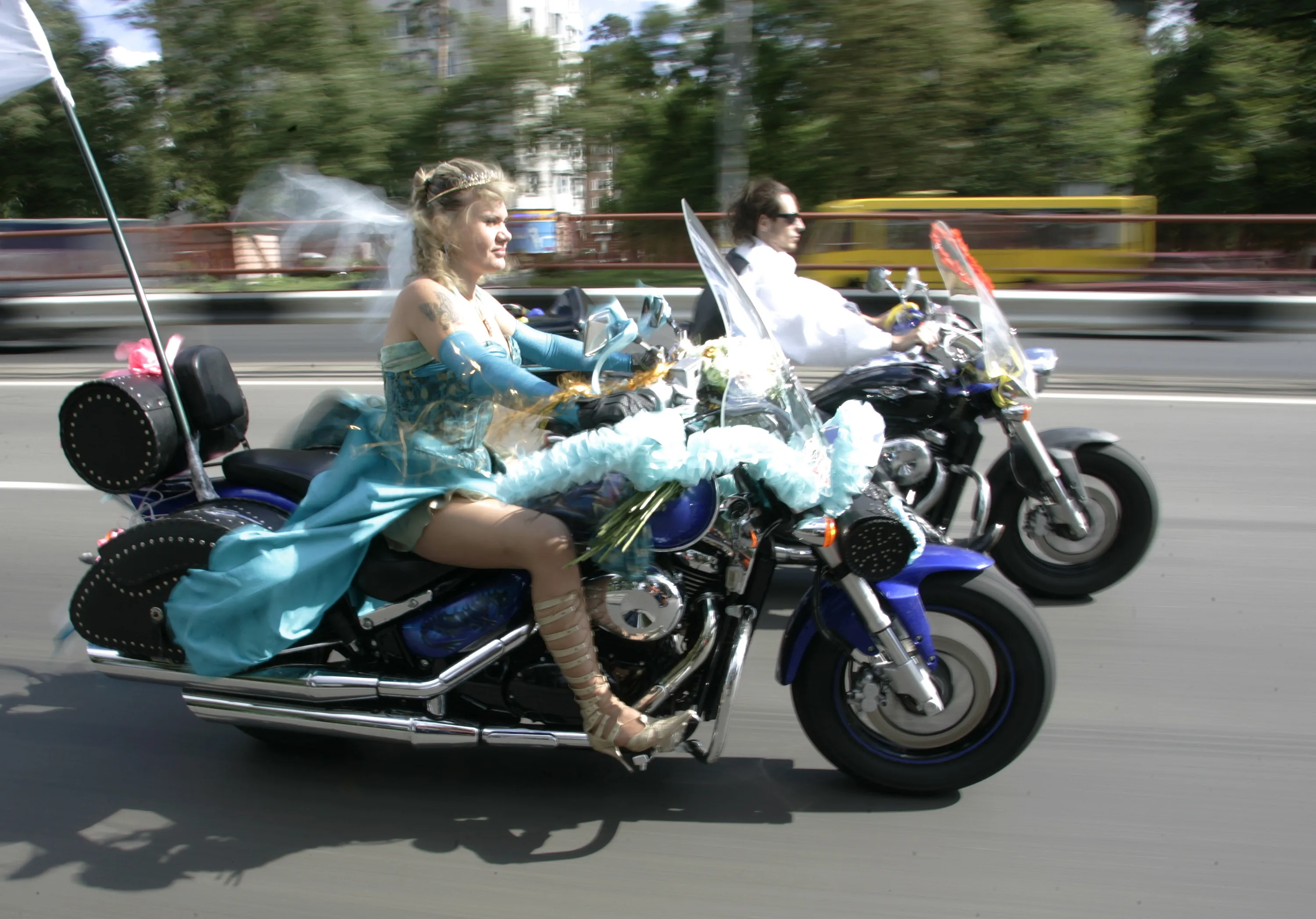 Yevgeni Okayevich (R) and his bride Galina Grann ride their motorbikes during their wedding in central Kiev July 5, 2008. (Photo by Konstantin Chernichkin/Reuters)