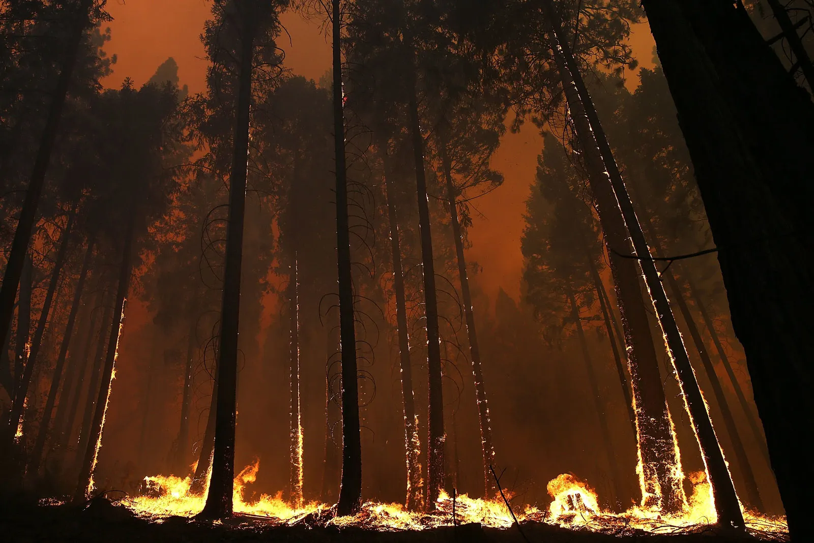 Fire consumes trees along US highway 120 as the Rim Fire burns out of control on August 21, 2013 in Buck Meadows, California. The Rim Fire continues to burn out of control and threatens 2,500 homes outside of Yosemite National Park. Over 400 firefighters are battling the blaze that is only 5 percent contained. (Photo by Justin Sullivan/AFP Photo)