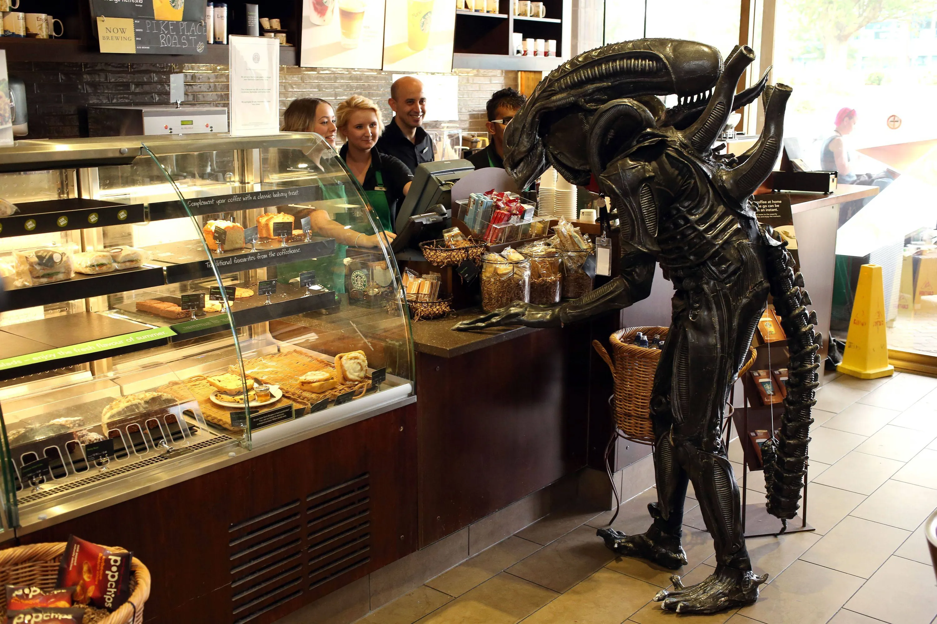 A Si-Fi enthusiast dressed as the alien from the iconic science fiction film Alien poping into a Starbucks as he attends the Nine Worlds Geekfest at the Radisson Hotel near Heathrow, on August 11, 2013. It is a weekend-long, multi-genre, residential event for sci-fi convention fans. (Photo by Steve Parsons/PA Wire)