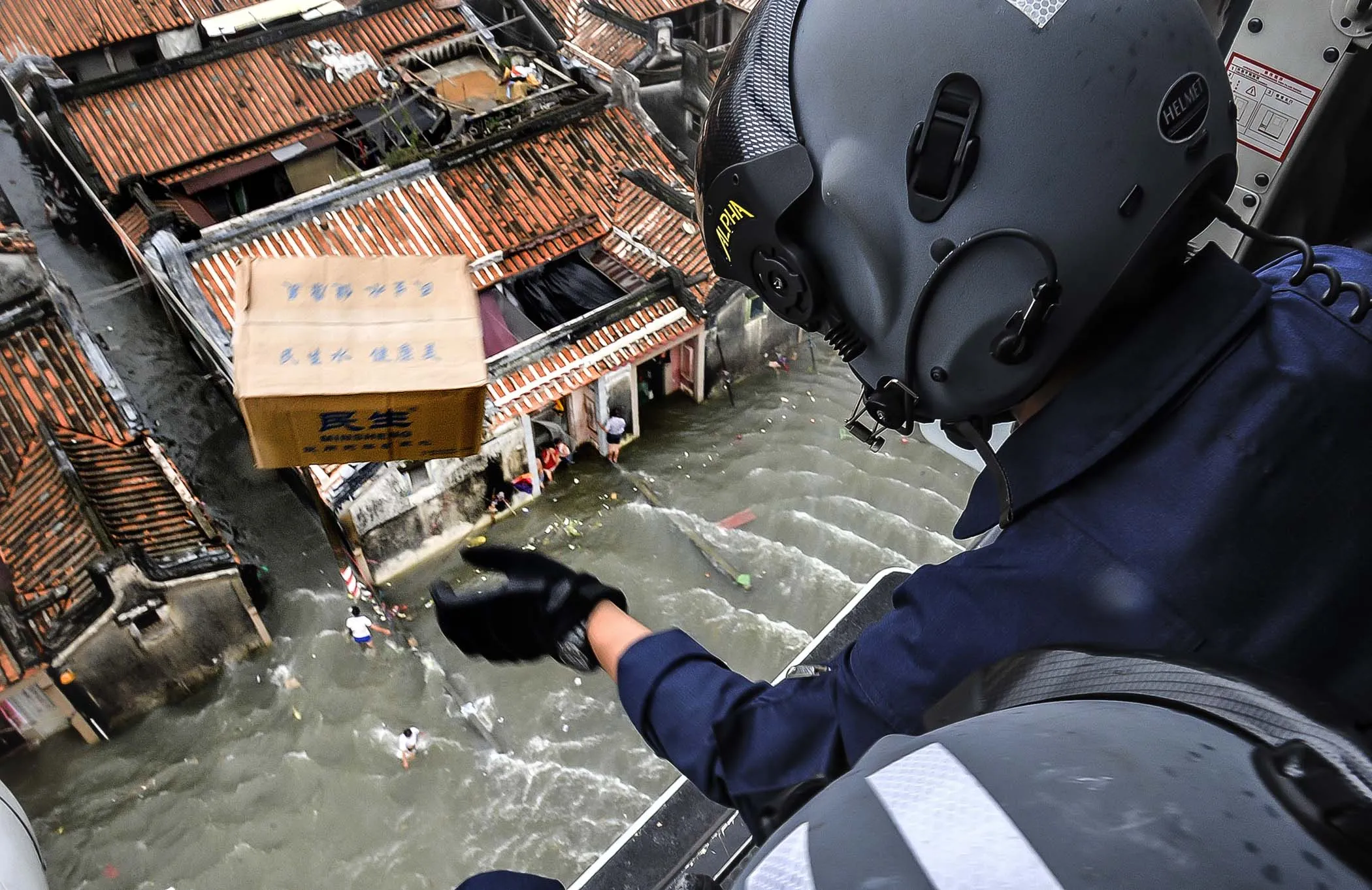 A rescue worker throws a box containing water out of a helicopter above a flooded area in Shantou, Guangdong province, China, on August 21, 2013. Flooding triggered by rainstorms have ravaged the city for the last few days, affecting 772,000 people across 11 townships, according to local media. (Photo by China Daily)