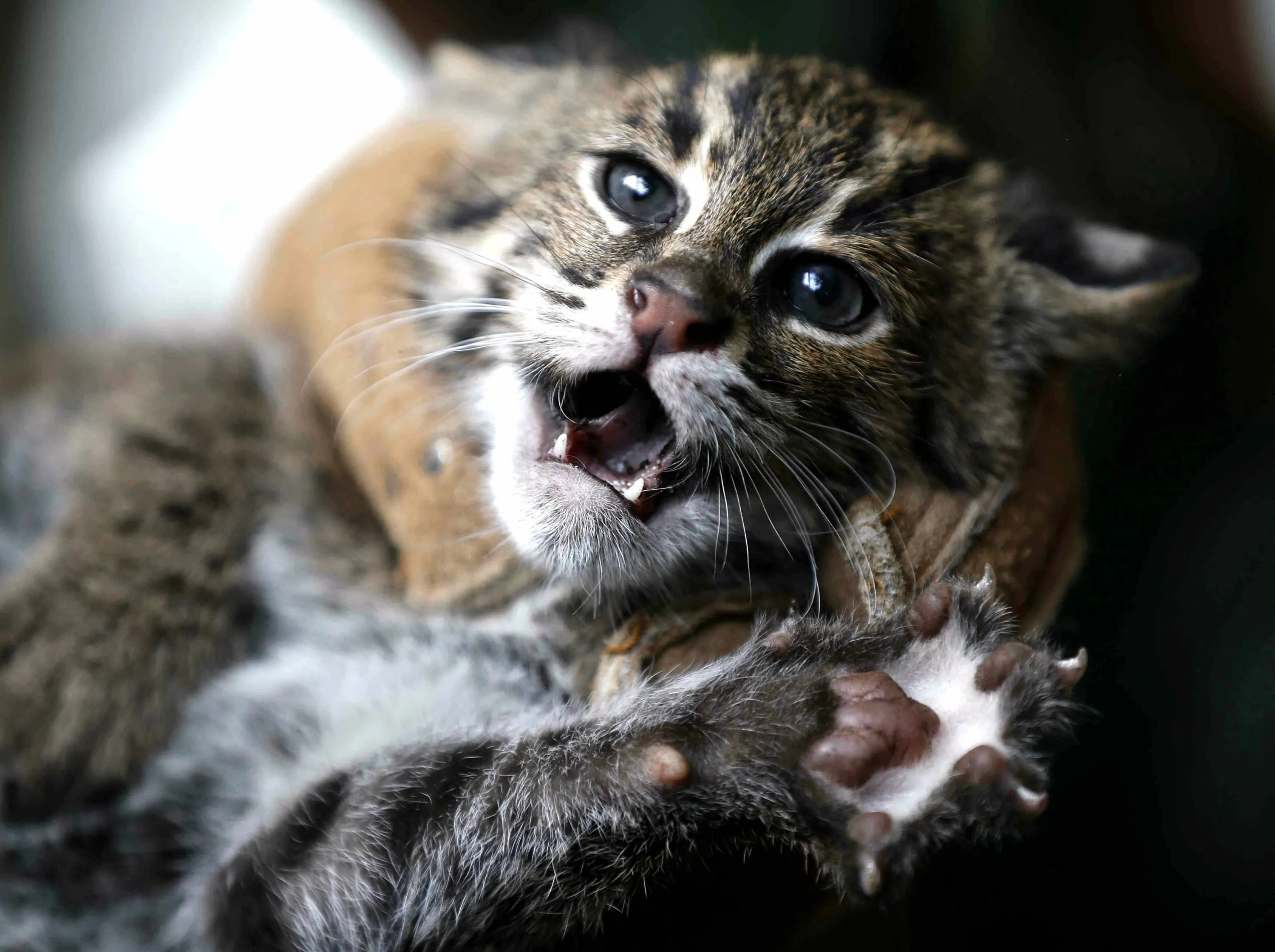 A zoo keeper holds one of three eight week old fishing cat cubs at the Zoo in Duisburg, Germany, on Wednesday, August 28, 2013. The cubs with webs on their paws are quite rare and belong to a threatened species. The cats are able to swim to chase for fish. (Photo by FrankAugstein/AP Photo)