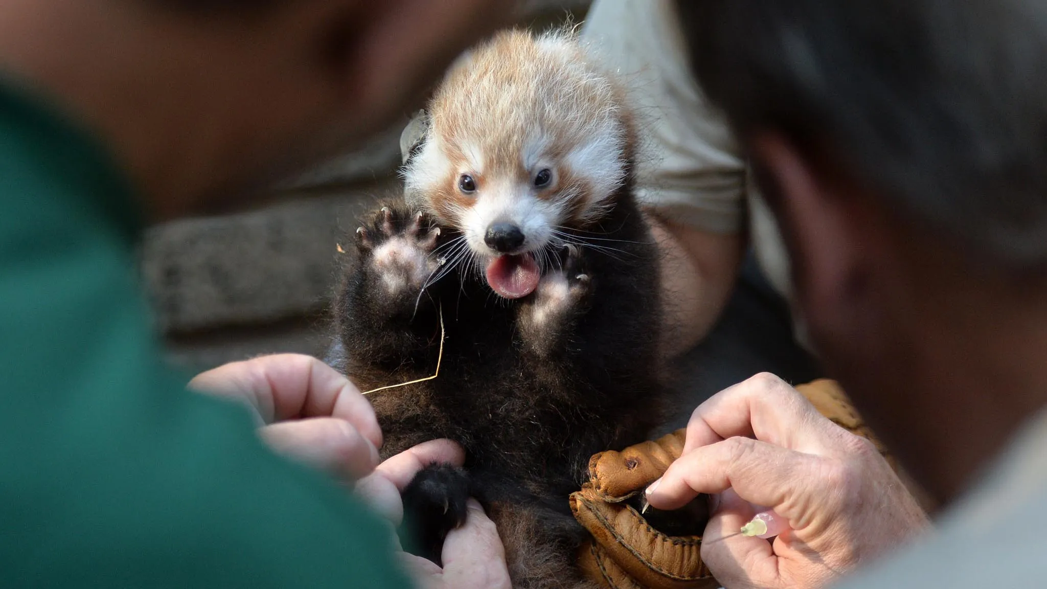 Zoo keepers Juliane Country hold a two-month-old female panda during a prophylaxis on August 22, 2013 at the Zoo in Leipzig, eastern Germany. (Photo by Hendrik Schmidt/AFP Photo/DPA)