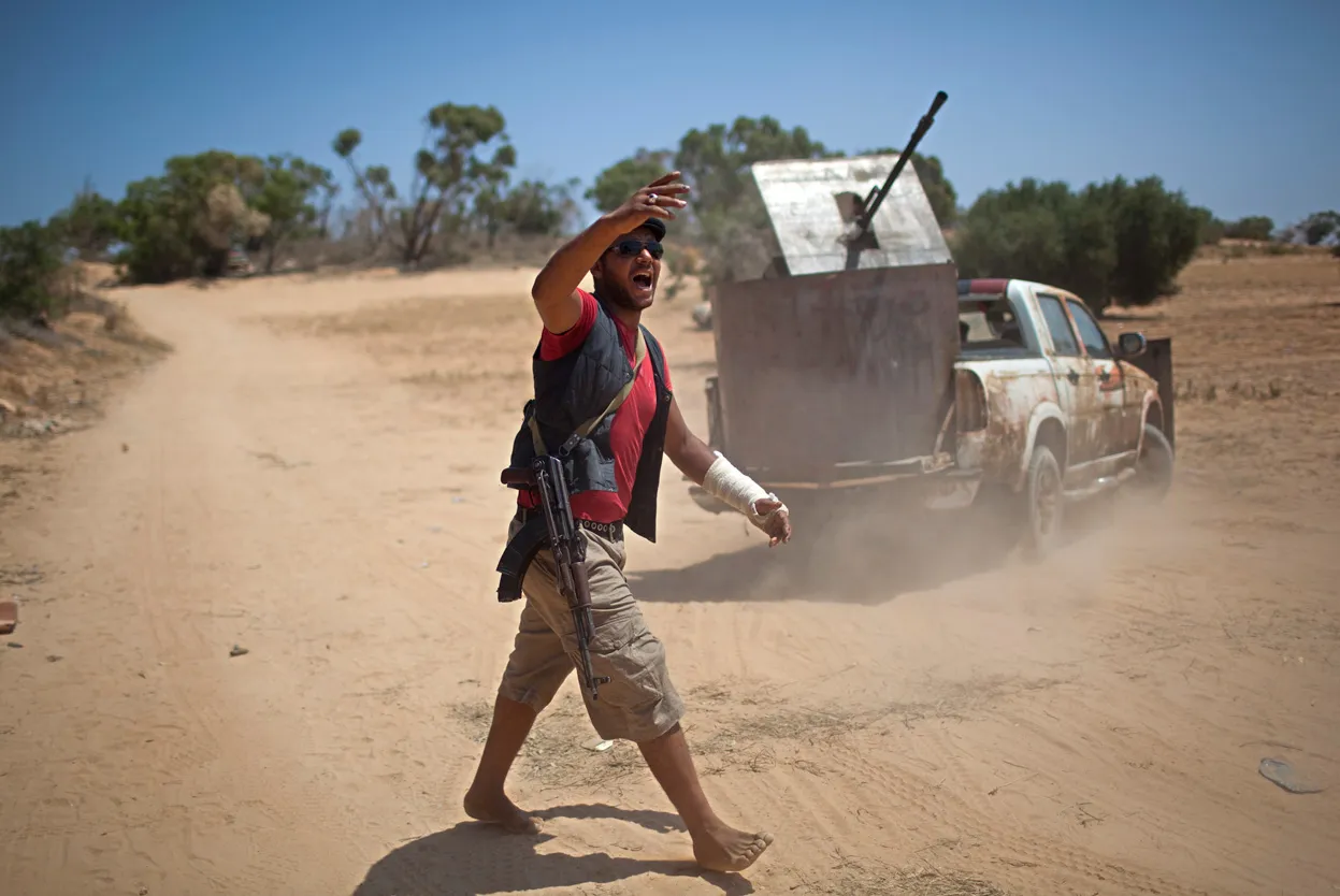 A rebel fighter in front of an armored technical gives orders to comrades at the front line between the rebels and pro-Qaddafi forces, 25 km west of Misurata, on May 26, 2013. (Photo by Rodrigo Abd/AP Photo)