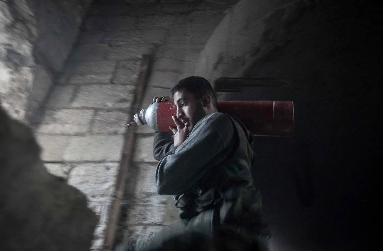 A rebel fighter carries an improvised explosive device as they try to repel a coordinated attack using mortar, tank and aerial artillery fire carried out by loyalists to President Bashar Assad in the Jedida district of Aleppo, on November 3, 2012. (Photo by Narciso Contreras/AP Photo)