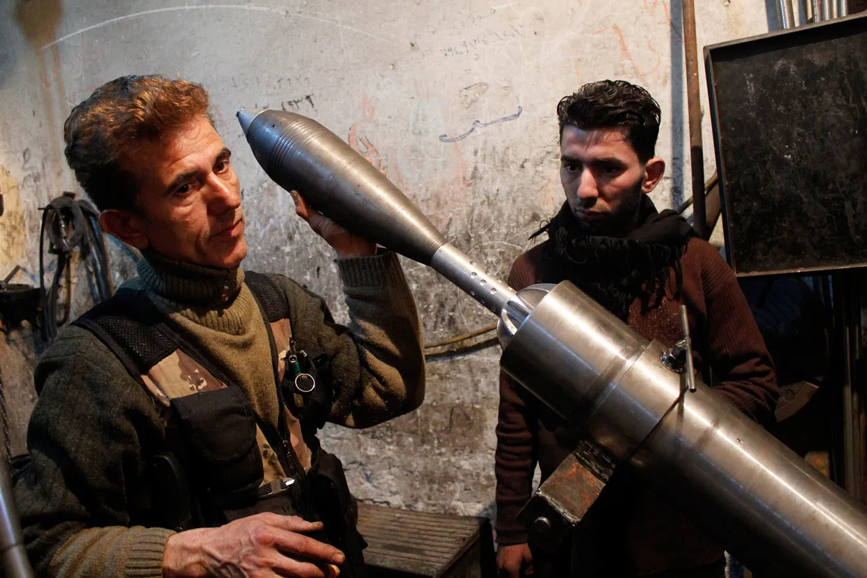 A “Free Syrian Army” fighter holds an improvised mortar shell inside a factory which previously manufactured steel and iron in Aleppo February 18, 2013. (Photo by Hamid Khatib/Reuters)