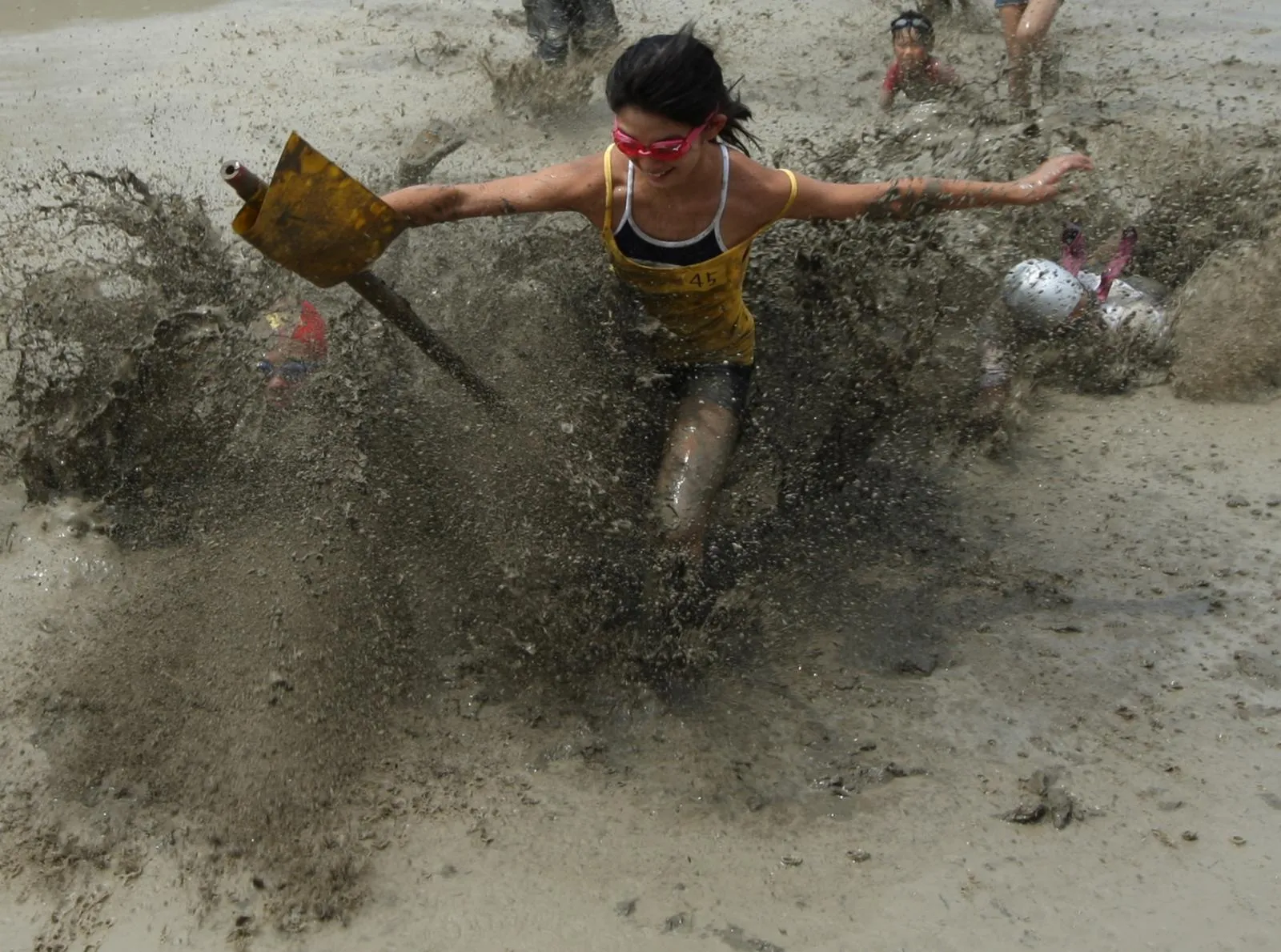Japanese festival-goer runs to catch a flag during the village mud festival at Yumesaki on August 18, 2013 in Himeji, Japan. The festival has been held annually to encourage youths of the village to participate in the community. (Photo by Buddhika Weerasinghe/Getty Images)