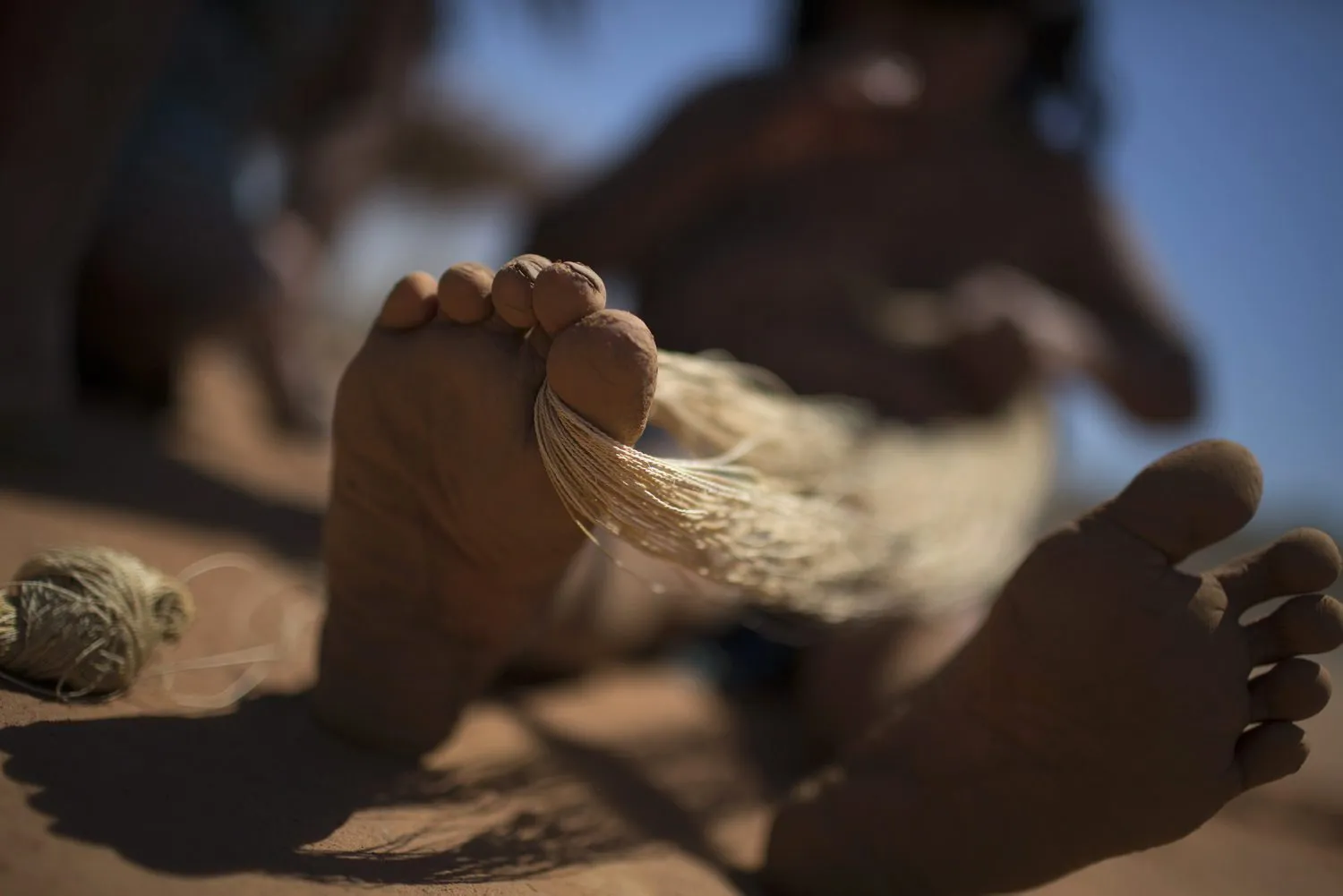 A Waura Indian weaves during this year's “quarup”, a ritual held over several days to honour in death a person of great importance to them, in Xingu National Park, Mato Grosso State, August 24, 2013. This year the Waura tribe is honouring their late cacique (chief) Atamai, who died in 2012 and helped created the Xingu Park, and his important contribution in facilitating communication between white Brazilians and Indians. (Photo by Ueslei Marcelino/Reuters)