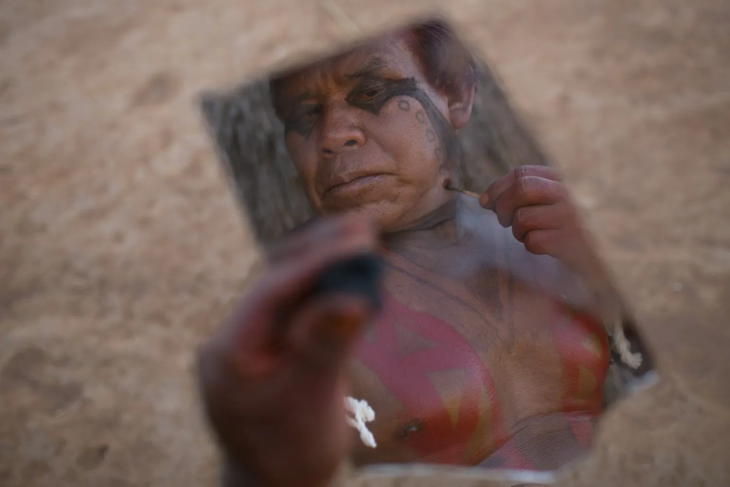 A Waura Indian man paints his face to participate in this year's “quarup”, a ritual held over several days to honour in death a person of great importance to them, in the Xingu National Park, Mato Grosso State, August 24, 2013. This year the Waura tribe honoured their late cacique (chief), Atamai, who died in 2012, for his work creating the Xingu Park and his important contribution in facilitating communication between white Brazilians and Indians. (Photo by Ueslei Marcelino/Reuters)