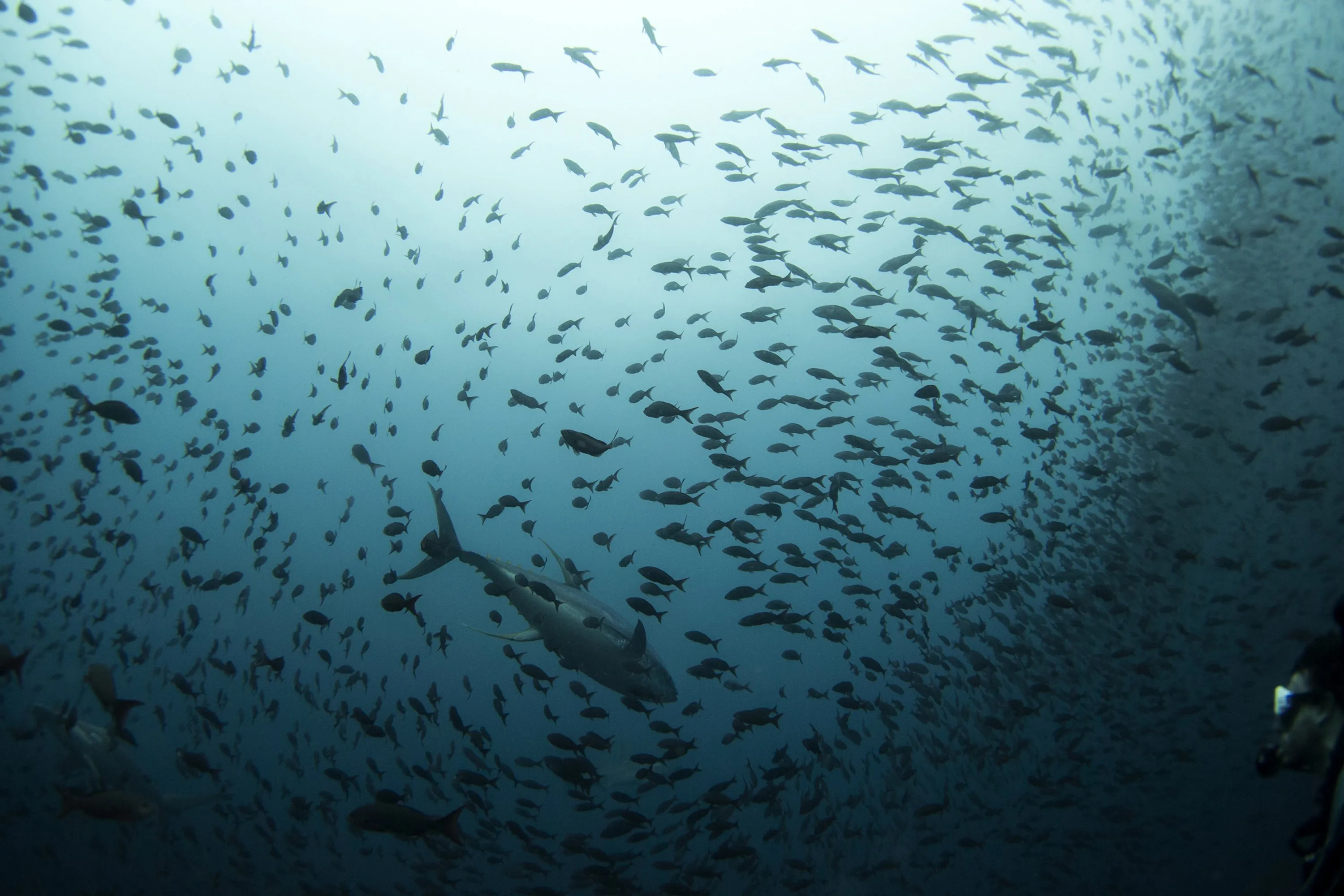 A tuna swims among a school of fish as a scuba diver looks on at Galapagos Marine Reserve August 19, 2013. (Photo by Jorge Silva/Reuters)