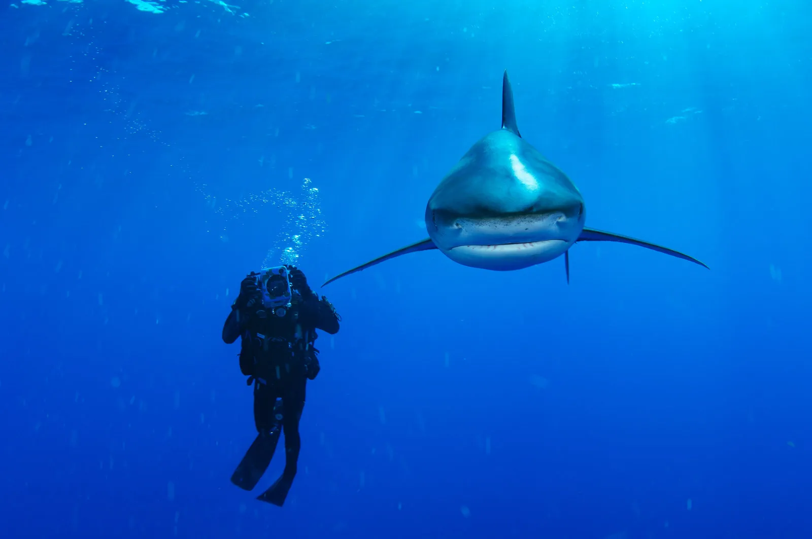 This Bahamian oceanic whitetip shark, known for the distinctive coloring on its white-tipped, rounded extremities, is part of a globally threatened species due to overfishing demands, primarily for its fins. (Photo by Brian Skerry)