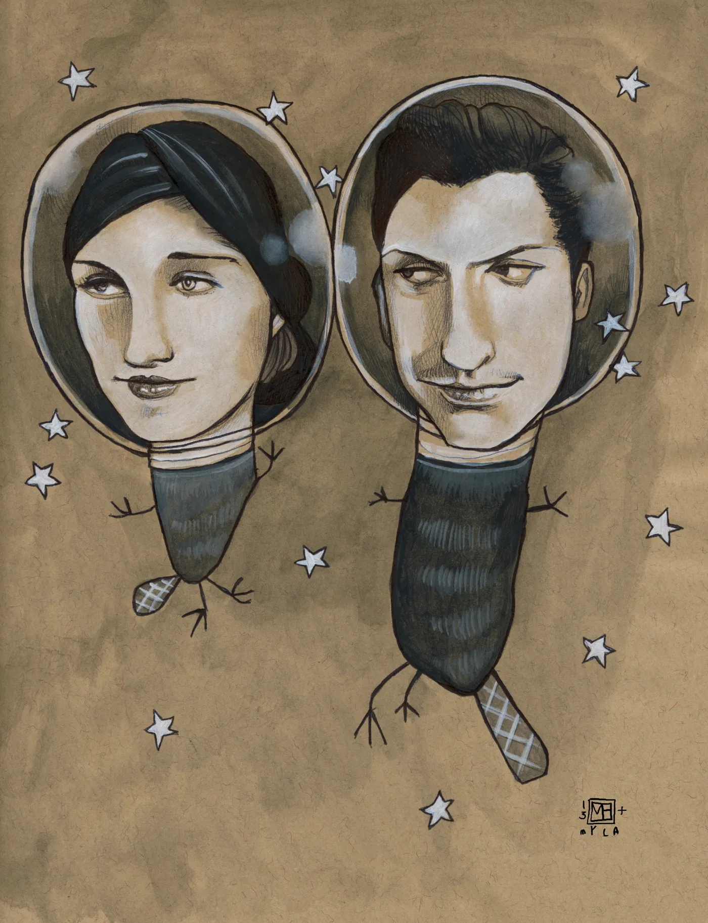 In one of the best collaborations this blog has seen in ages, professional illustrator Mica Angela Hendricks has been collaborating with her 4-year-old daughter on a series of wonderful drawings that pass back and forther between mother and daugher until reaching an always unexpected final form. Each drawing begins with Hendricks drawing a detailed retro-ish head, after which her daughter snatches away the sketchbook to create rudimentary body (or animal!) parts as well as other random details. Afterward Hendricks goes back in to polish things up a bit and behold: dinosaur women, slug ladies, and beaver astronauts are born.