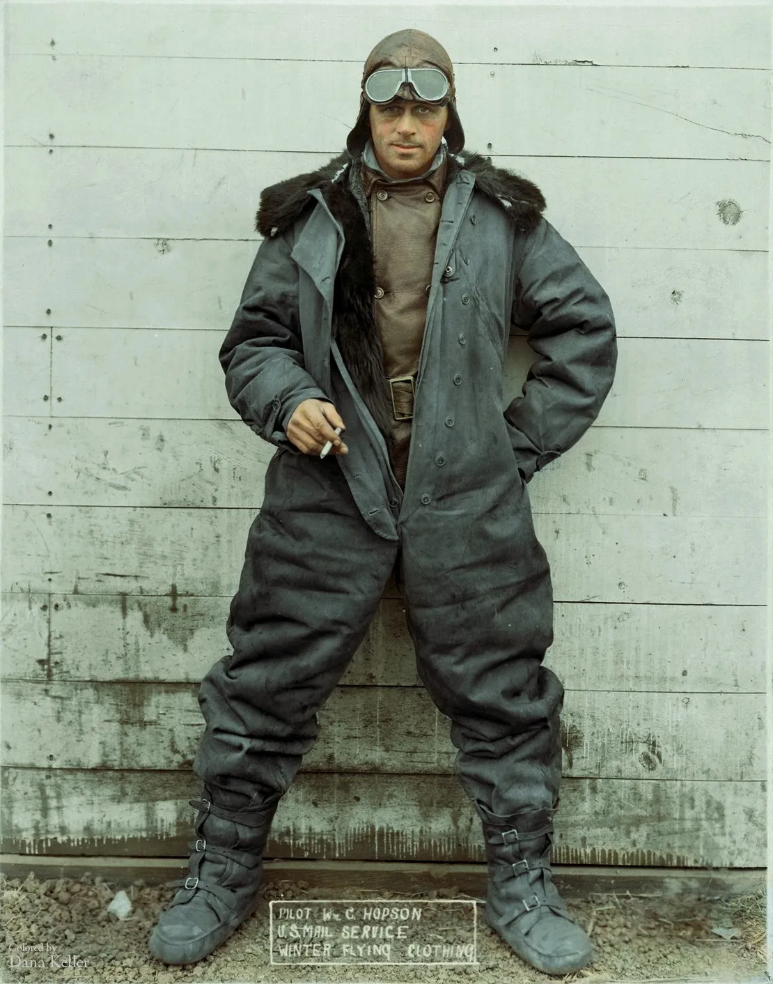 Pilot William “Wild Bill” Hopson, modeling U.S. Mail Service Winter Flying Clothing, ca. 1926.