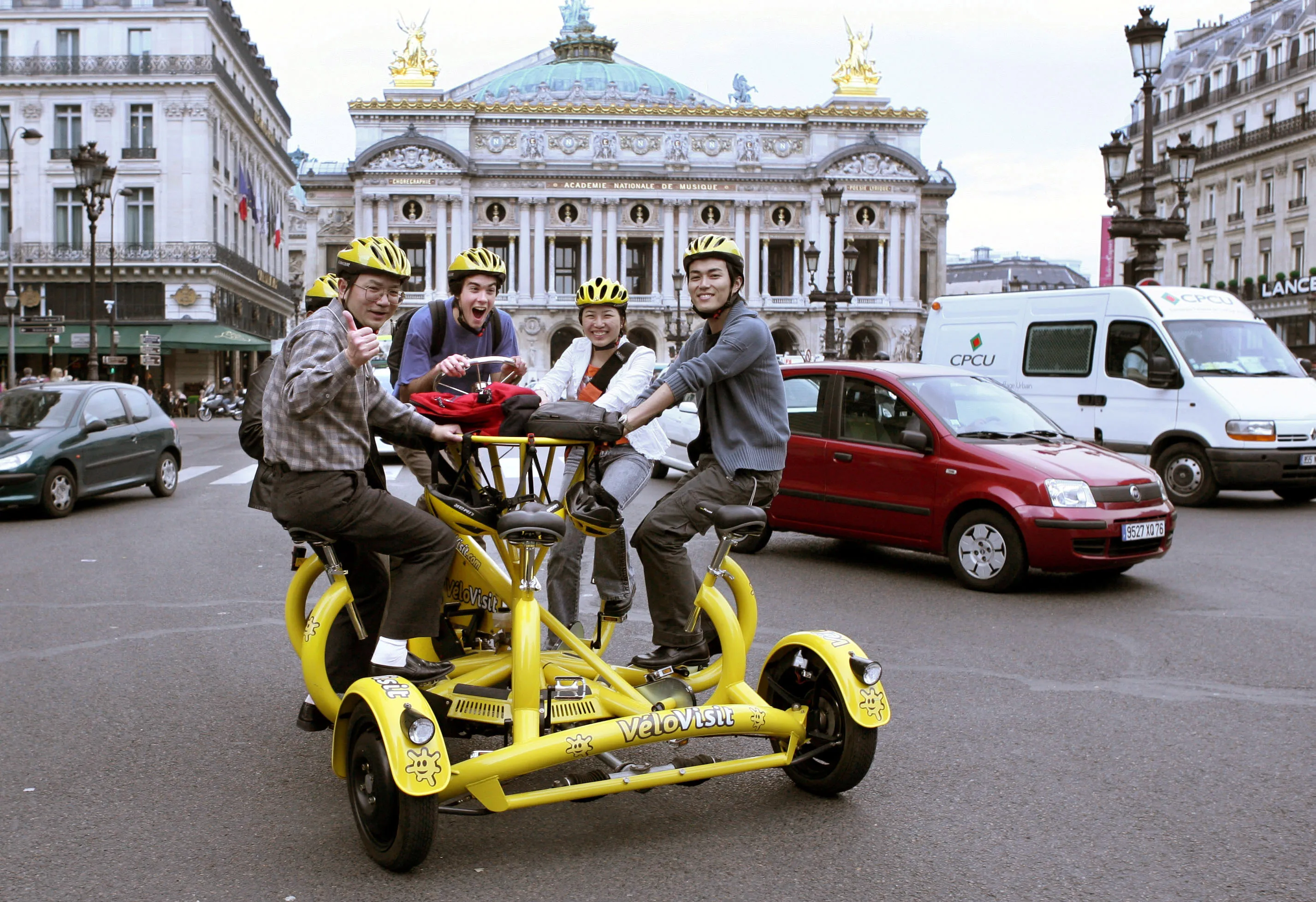 Tourists pass by the Paris Opera on a Velovisit in Paris April 24, 2006. The bike has seven seats designed for a driver and six passengers who sit in a circle and chat while pedalling. The driver holds the handlebars, which look more like a steering wheel, and is responsible for braking. The Velovisit can be hired for a tour through Paris, with or without a guide. (Photo by Charles Platiau/Reuters)