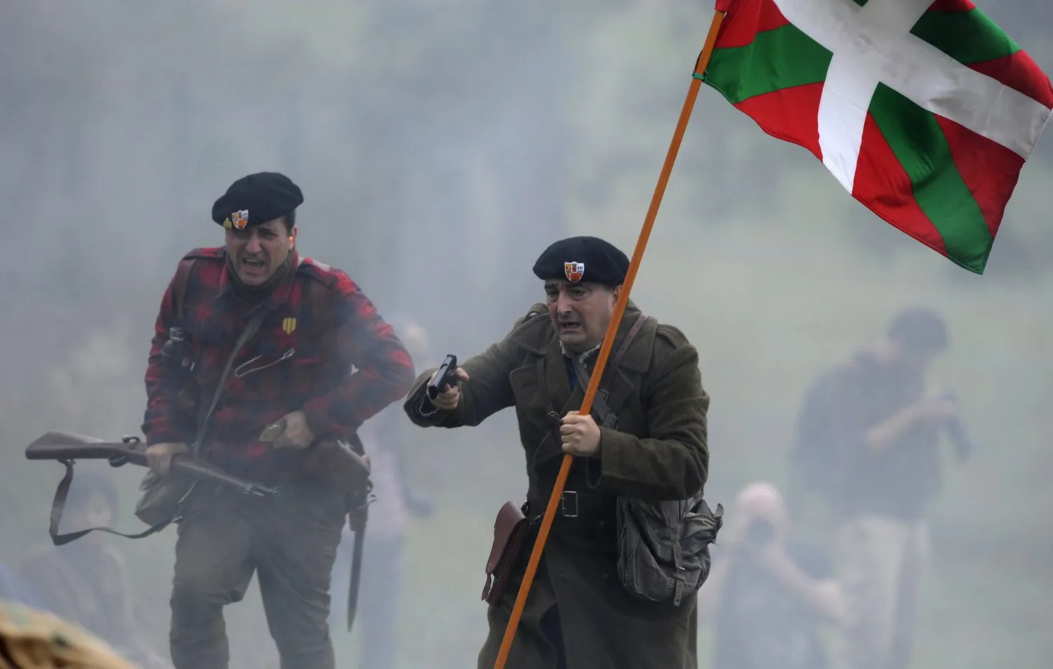 Aitor Esteban, a deputy of the PNV (National Basque Party), holds a gun and an “ikurrina” flag during a re-enactment of the "Battle of Areces" that took place during the Spanish Civil War, in Grullos, north of Spain, September 14, 2013. The re-enactment of the historic 1937 battle was organised by the Frente del Nalon Association. (Photo by Eloy Alonso/Reuters)