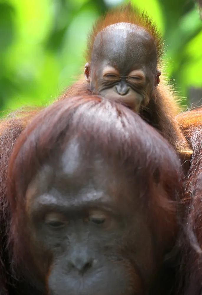 One month-old endangered Bornean Orang Utan clings on to his mother named Miri on Wednesday March 6, 2013 in Singapore. The Singapore Zoo is renowned for its flagship animal, the Orang Utan, and exhibits both the endangered Bornean and critically endangered Sumatran sub-species in a social setting. It is also known for its efforts in promoting and educating the public about the importance of wildlife conservation through its educational programs and breeding of these endangered species. (Photo by Wong Maye-E/AP Photo)