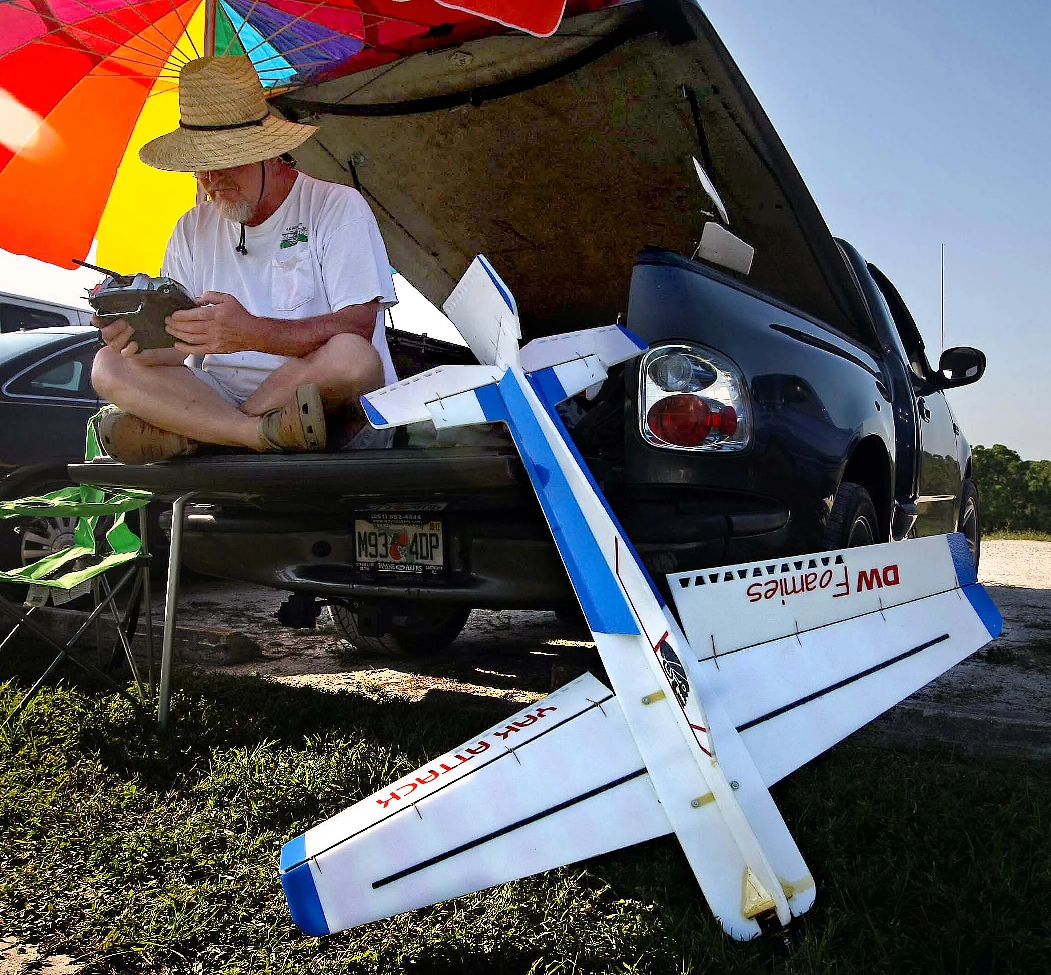Phil Petty examines his multiple channel radio control as his plane rests next to him at Phil Wherry Field. “I have a bunch of hubbies”, Petty said, “but in particular these (RC Bush Pilots) are a great bunch of people”. (Photo by Bill Ingram/The Palm Beach Post)