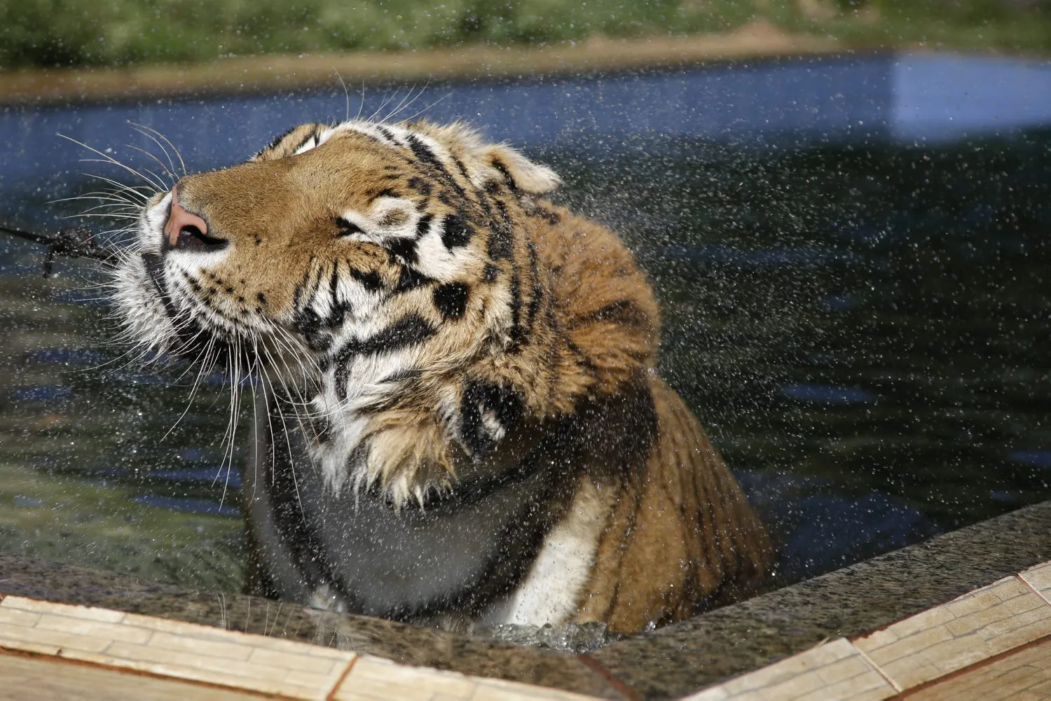 A tiger named Tom shakes off water as he swims in a pool in the backyard of Ary Borges, his caretaker in Maringa, Brazil, Thursday, Sept. 26, 2013. Borges, who cares for Tom, eight other tigers and two lionesses, is in a legal battle with federal wildlife officials to keep his endangered animals from undergoing vasectomies and being taken away from him. (Photo by Renata Brito/AP Photo)