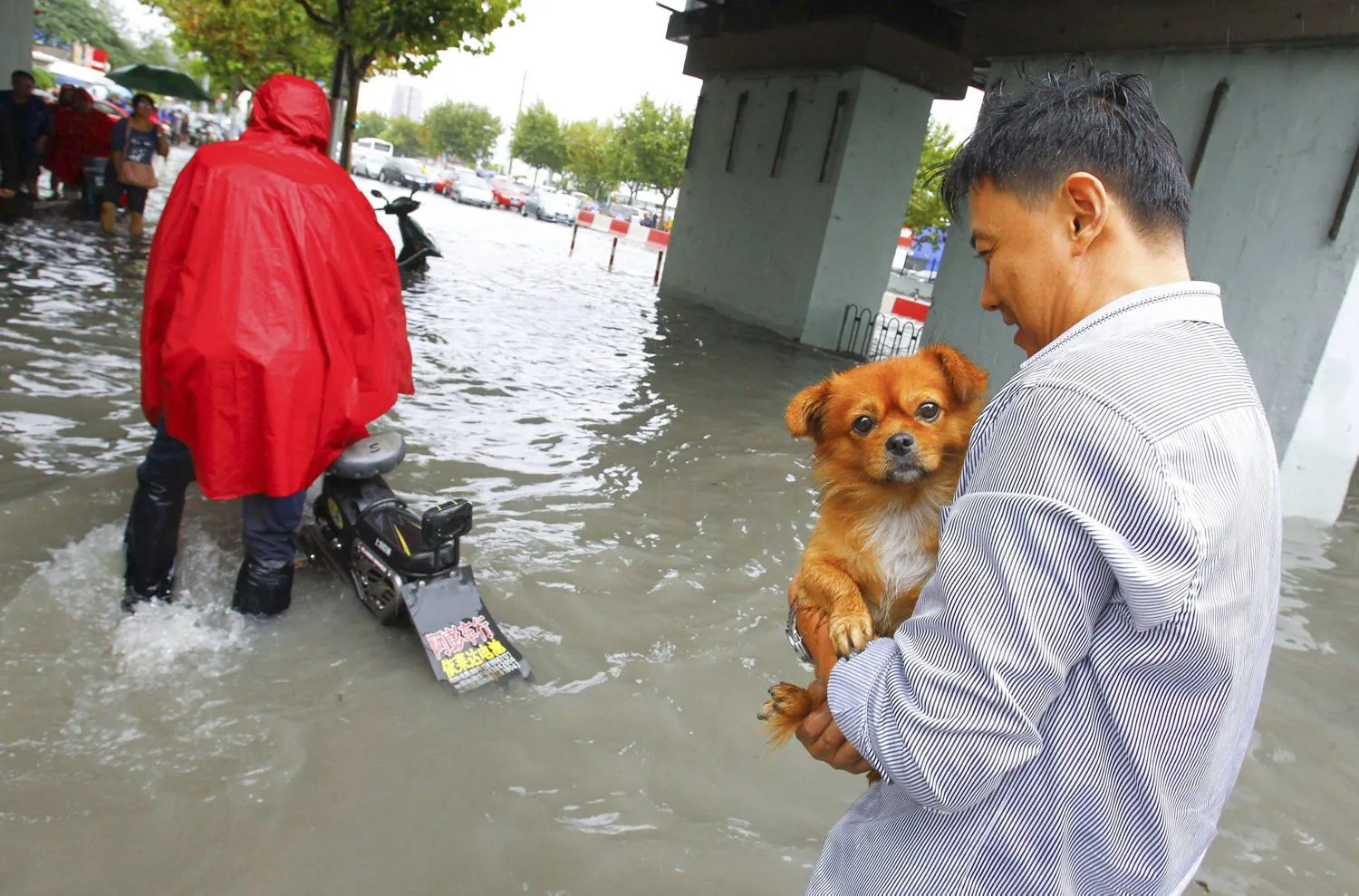 A man holds his dog as he walks along a flooded street after Typhoon Fitow hit Shanghai October 8, 2013. Four people were killed and hundreds of thousands evacuated after Typhoon Fitow hit eastern China, destroying houses and farmlands and closing ports and airports. (Photo by Reuters/Stringer)