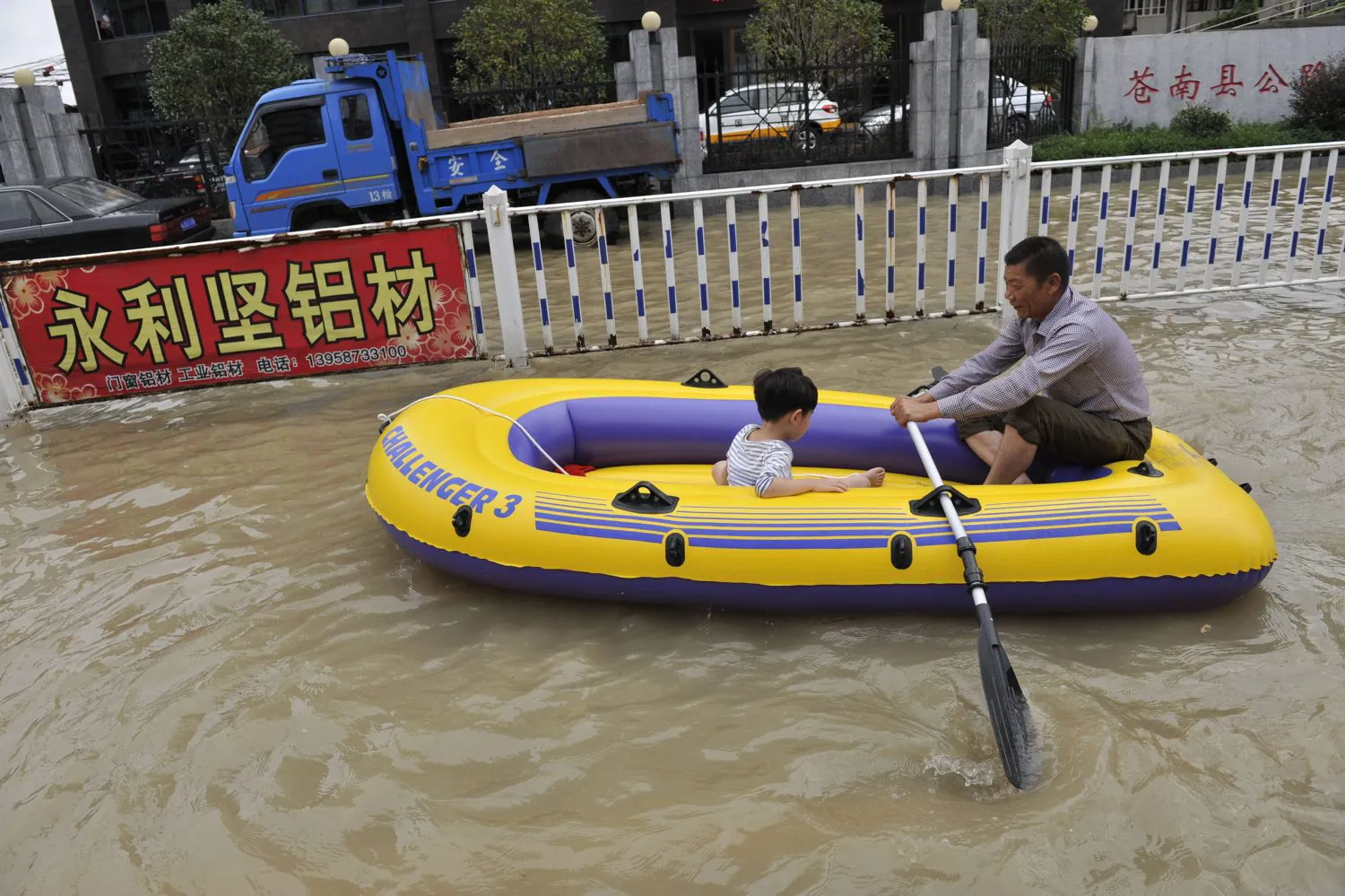 Residents make their way through a flooded street on an inflatable boat in disaster-hit Cangnan county of Wenzhou, east China's Zhejiang province, on October 7, 2013, where more than 1,200 homes collapsed and damages amounted to hundreds of millions of yuan. Typhoon Fitow barrelled into China's east coast, packing winds of more than 200 kilometres (125 miles) an hour, after hundreds of thousands of people were evacuated and bullet train services were suspended. At least three people were reported killed, all of them near the city of Wenzhou in Zhejiang province, the state broadcaster CCTV said. (Photo by AFP Photo)