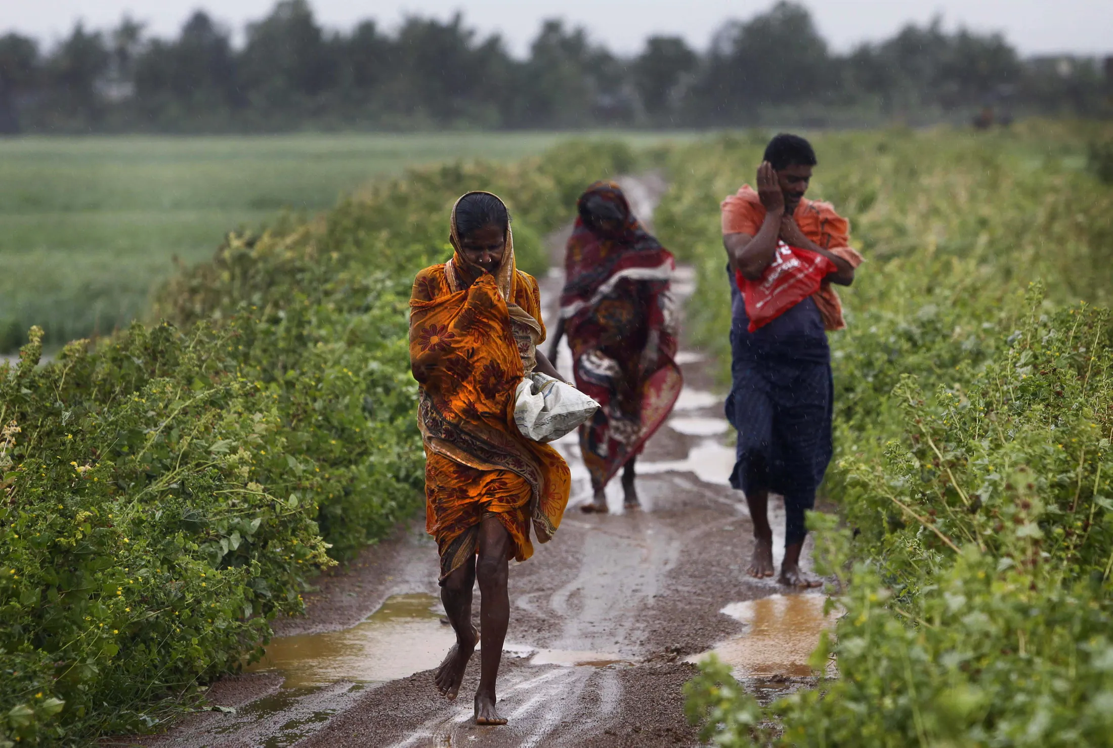 Indian villagers braving strong winds and rain reach for a cyclone center, in village Podampeta, in Ganjam district about 200 kilometers (125 miles) from the eastern Indian city Bhubaneswar, India, Saturday, Oct. 12, 2013. Strong winds and heavy rains pounded India's eastern coastline Saturday, as hundreds of thousands of people took shelter from a massive, powerful Cyclone Phailin expected to reach land in a few hours. (Photo by Biswaranjan Rout/AP Photo)