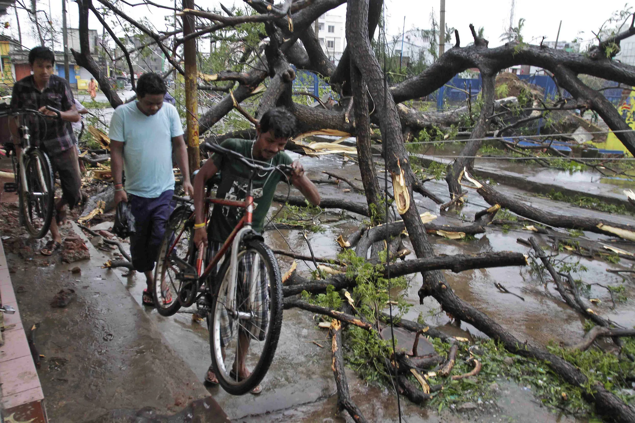 Indian men with their bicycles make way through uprooted trees fallen during Cyclone Phailin on a road in Berhampur, India, Sunday, Oct. 13, 2013. An immense, powerful cyclone that lashed the Indian coast, forcing 500,000 people to evacuate and causing widespread damage, weakened Sunday after making landfall. Several people died in the rains that fell ahead of the storm, most killed by falling branches, Indian media reported, but the situation on the ground in many areas was still unclear after Cyclone Phailin slammed into the coast Saturday evening in Orissa state, where power and communications lines were down along much of the coastline. (Photo by Bikas Das/AP Photo)
