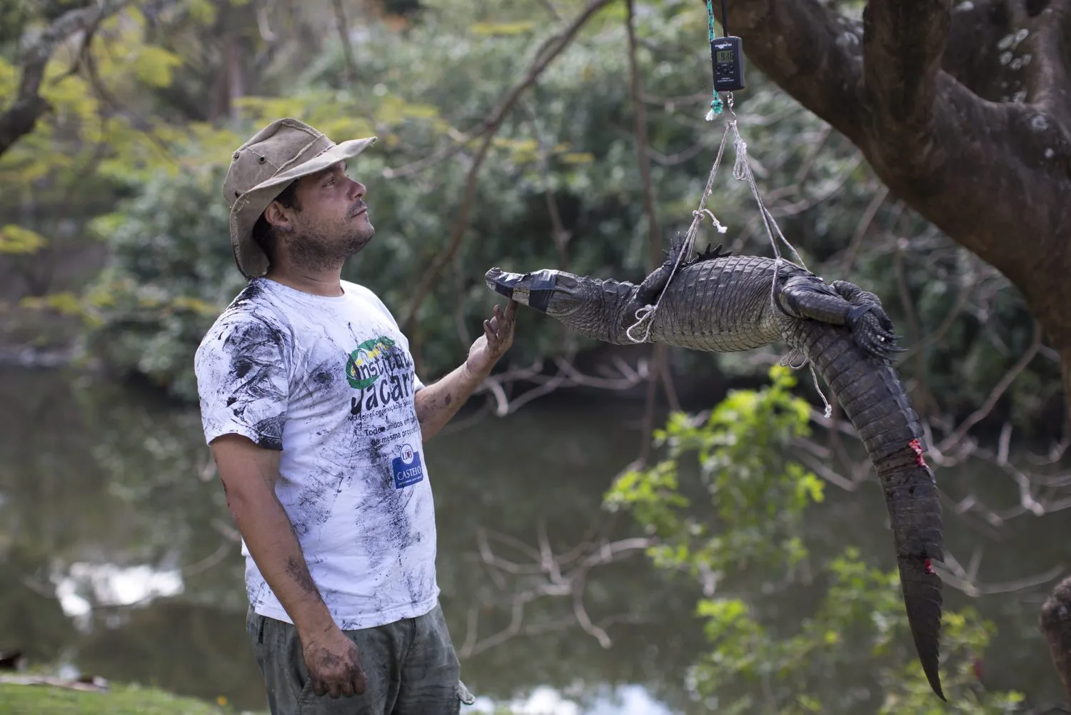 In this Oct. 14, 2013 photo, ecology professor Ricardo Freitas weighs a broad-snouted caiman before releasing it back in the water channel in the affluent Recreio dos Bandeirantes suburb of Rio de Janeiro, Brazil. While local caimans average about 1.5 meters (4.9 feet) long and weigh about 10 kilograms (22 pounds), older males can be up to twice as long and much heavier. Still, Freitas has been known to dive into the water to catch some with his bare hands. (Photo by Felipe Dana/AP Photo)