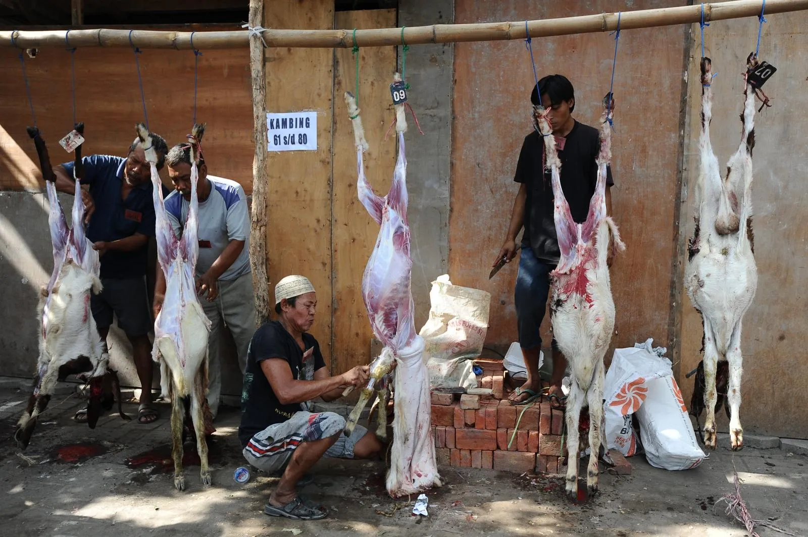 Indonesian Muslims slaughter goats as offering in Eid al-Adha on October 15, 2013 in Surabaya, Indonesia. Muslims worldwide celebrate Eid Al-Adha, to commemorate the Prophet Ibrahim's readiness to sacrifice his son as a sign of his obedience to God, during which they sacrifice permissible animals, generally goats, sheep, and cows. (Photo by Robertus Pudyanto/Getty Images)