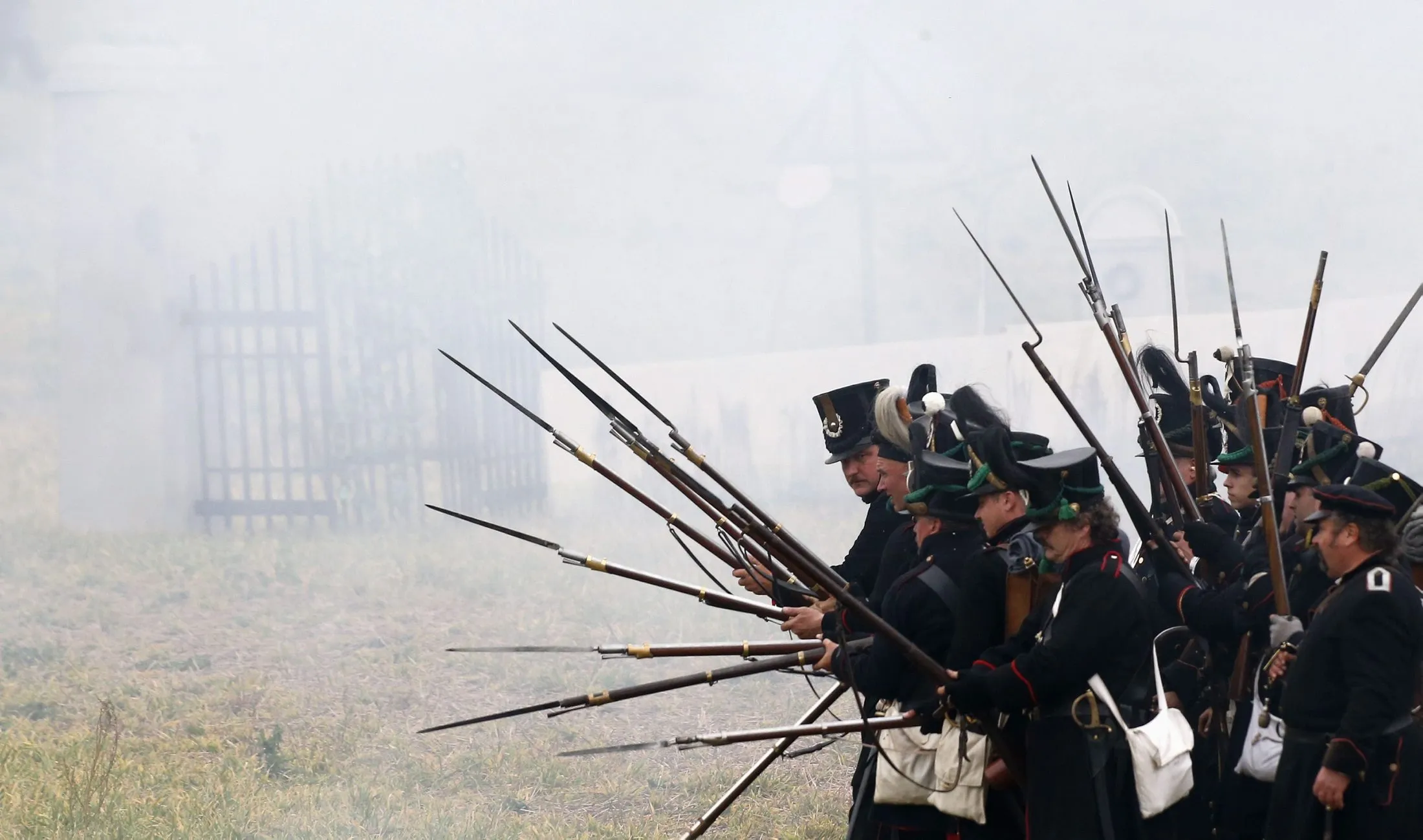 Performers wearing 19th century Allied forces military uniforms prepare to attack French forces during a reenactment of the Battle of the Nations, in a field in the village of Markkleeberg near Leipzig October 20, 2013. The east German city of Leipzig commemorated the 200th anniversary of the largest battle of the Napoleonic Wars on Sunday by reenacting the Battle of the Nations, with 6,000 military-historic association enthusiasts from all over Europe. The decisive encounter in which tens of thousands of soldiers were killed, took place from October 17-19, 1813, just outside of Leipzig. At the height of the hostilities Napoleon fielded more than 200,000 men against an Allied force of some 360,000 soldiers which included troops from Russia, Austria, Prussia and Sweden. (Photo by Fabrizio Bensch/Reuters)