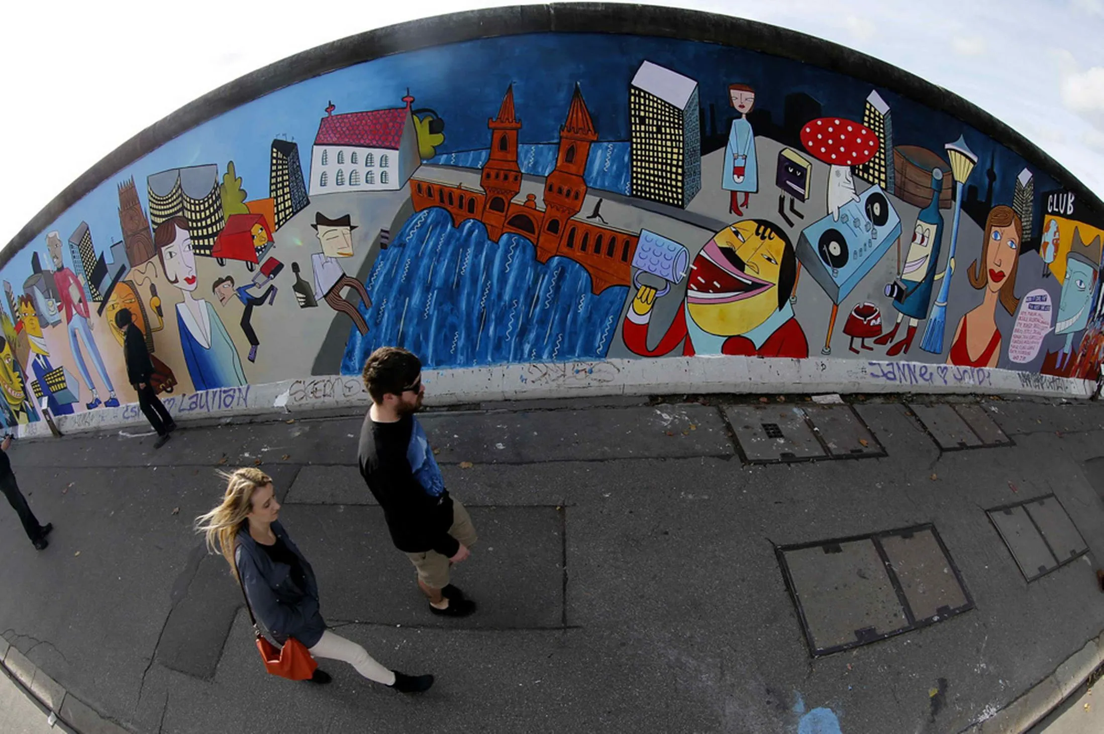 People walk past to the newly painted artwork of contemporary German Pop artist Jim Avignon at the open air 0.8-mile painted section of the Berlin Wall known as the “East Side Gallery” in Berlin, on Oktober 23, 2013. (Photo by Fabrizio Bensch/Reuters)