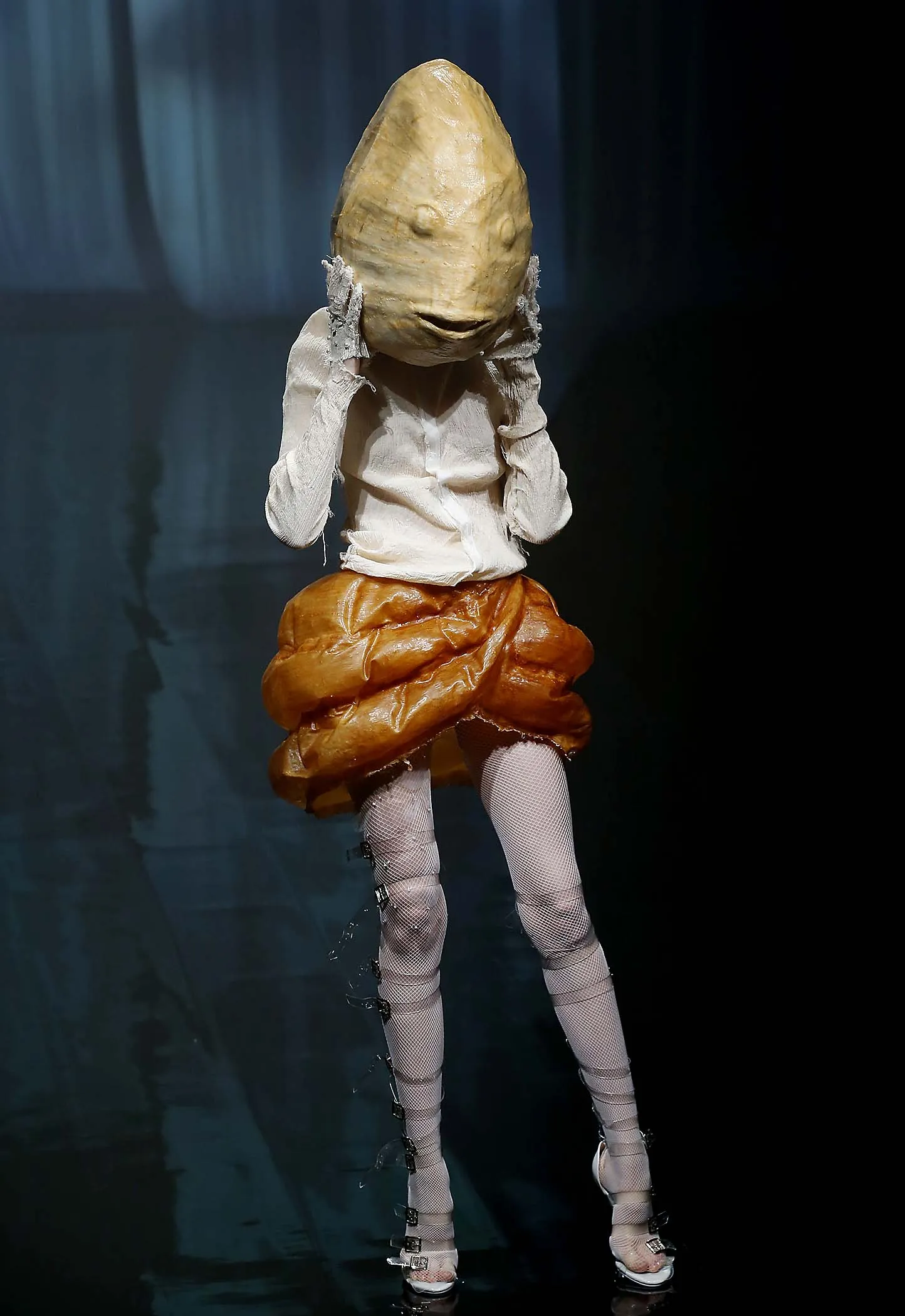 A model displays a creation of the 2014 Spring/Summer collection designed by Japan's Yasutaka Funakoshi during Tokyo Fashion Week, on Oktober 19, 2013. (Photo by Koji Sasahara/Associated Press)