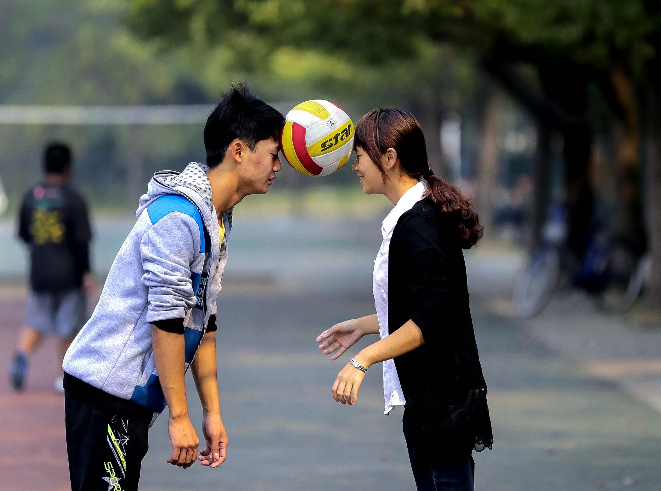 Students carry a volleyball using their foreheads in a game for improving cooperation at a campus in Wuhan, on Oktober 21, 2013. (Photo by Reuters)