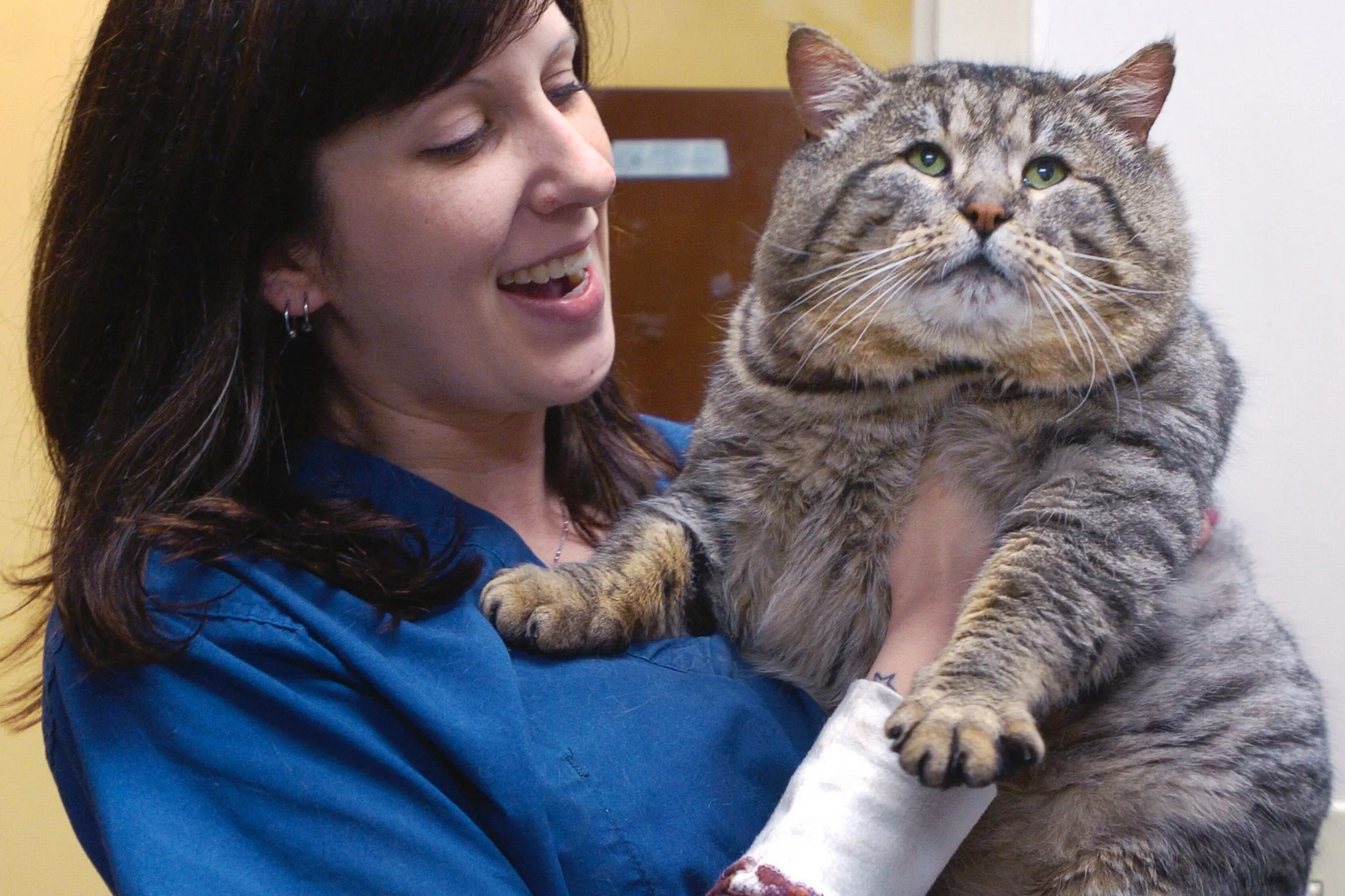 Tiffany Noreuil at the Oregon Humane Society in Portland, Oregon, holds feline Hercules, a 20-pound stray whose girth got him stuck in a pet door while trying to plunder some dog food. (Photo by AP Photo)