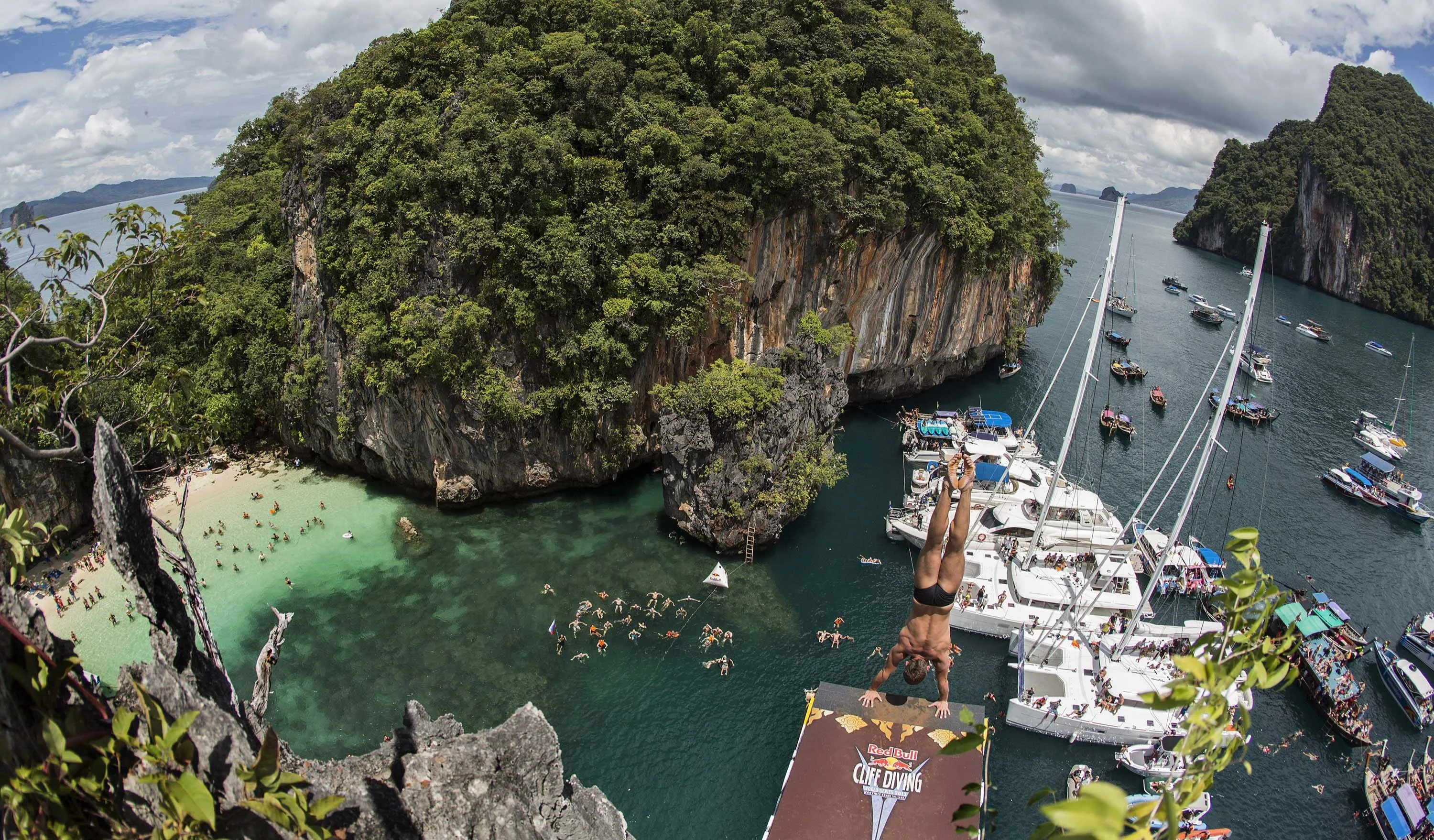 In this handout image provided by Red Bull, Artem Silchenko of Russia prepares to launch an armstand dive from the 27 metre platform on Hong Island in the Andaman Sea during the last competition day of the eighth and final stop of the 2013 Red Bull Cliff Diving World Series on October 26, 2013 at Krabi, Thailand. (Photo by Romina Amato/Red Bull via Getty Images)